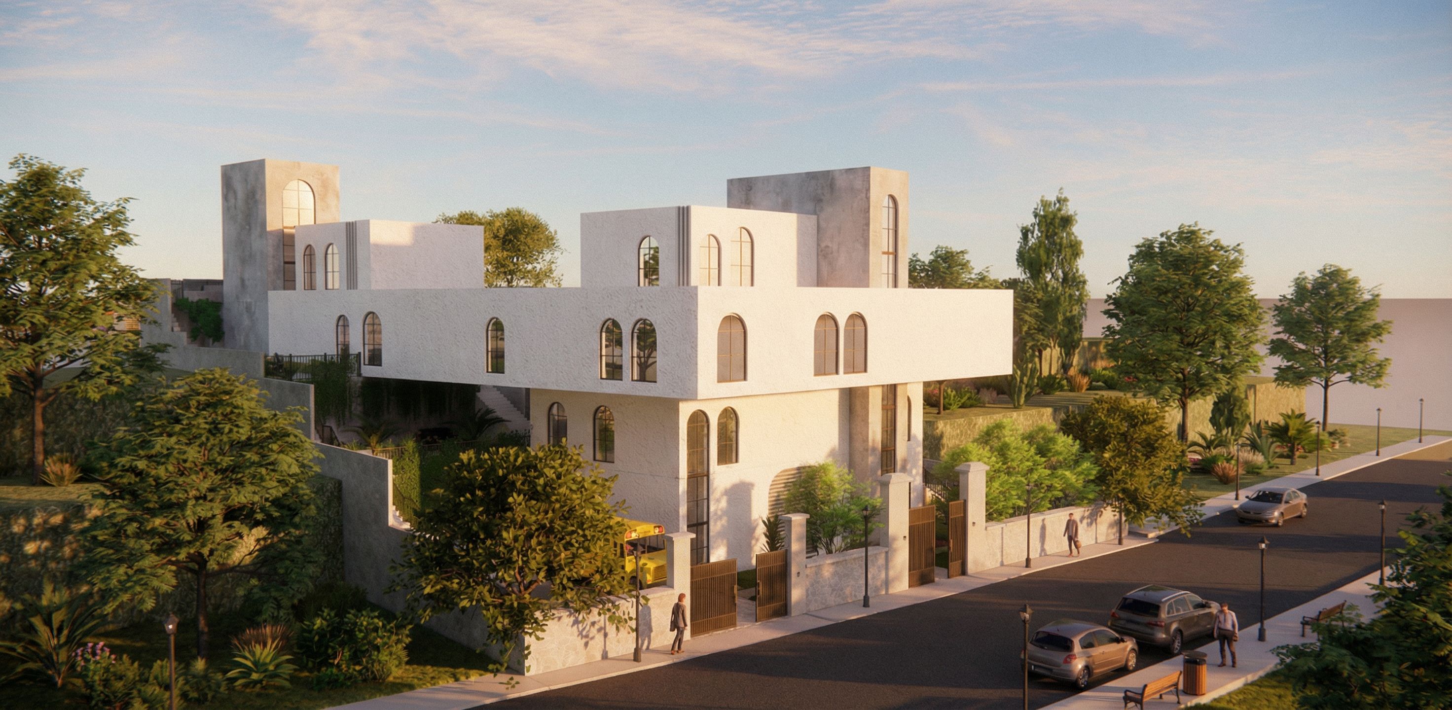 Transform the provided architectural facade into a fully realistic, high-quality image that appears as a completed and fully constructed building. Ensure absolute preservation of all proportions, dimensions, geometry, and architectural elements exactly as they are, with no additions, removals, or distortions. Enhance the facade using high-precision, realistic materials already present in the design, such as exposed concrete and clear, reflective glass. Apply detailed material textures that include subtle realistic imperfections such as surface variation, joints, connections, and natural color inconsistencies. Use physically accurate lighting, including correct sunlight direction, soft global illumination, natural ambient lighting, and realistic shadows to enhance depth and realism, while maintaining accurate perspective and correct camera angles. Add trees and minimal natural elements in the areas surrounding the project site to suggest sustainability, without overpowering or dominating the building. Create a balanced natural environment with subtle window reflections, delicate atmospheric effects, and fine construction details. The final result should resemble a professional architectural photograph of a completed building, highly realistic, clean, modern, and visually convincing. , keep exact camera angle