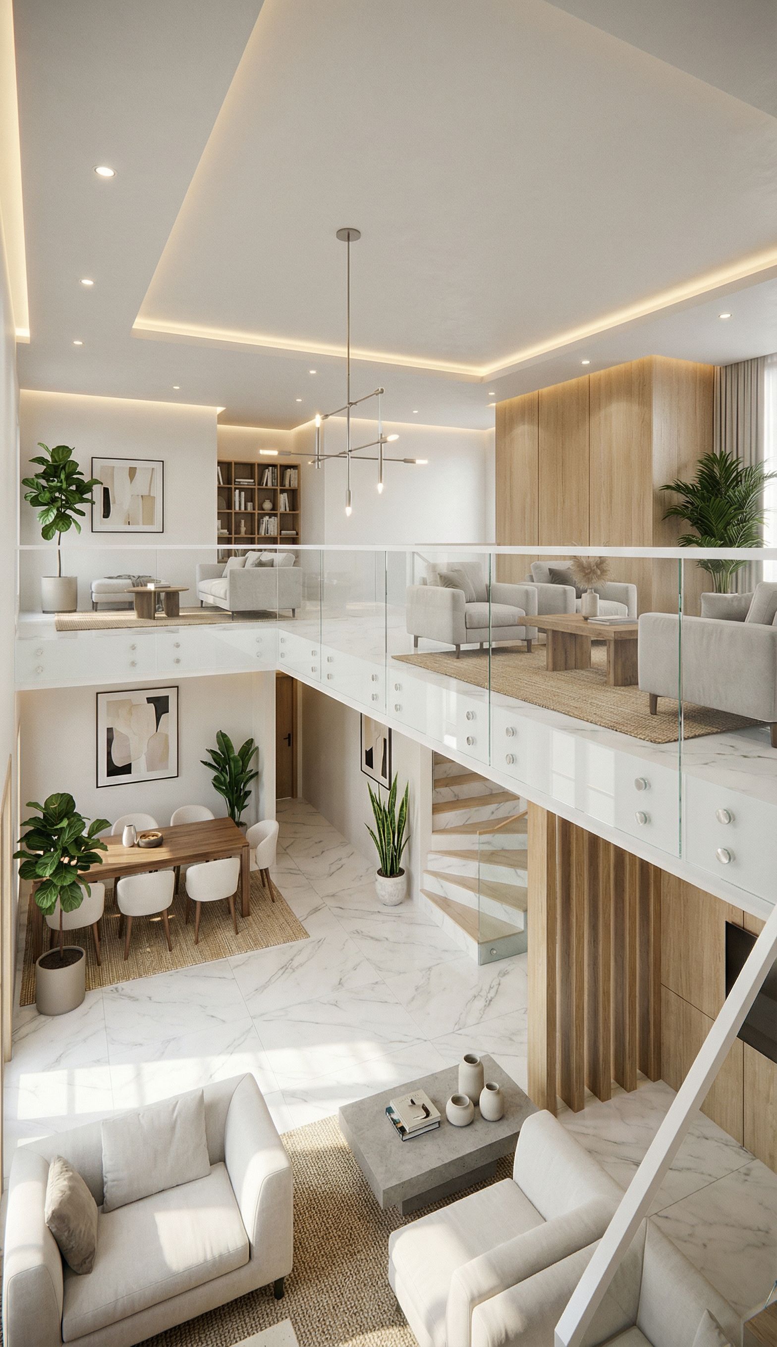 PromptNe change ni de volume ni d.architecture, Salon d’un duplex avec mezzanine, le même projet que le précédent traiter, marbre au sol, plafond en placo, design classe pro et épure, garde corp en vitre classe blanche comme sur L’image référence design 60% blanc-gris-sablé style moderne 20% matériaux naturels et 20% deco outil et aménagement ajouter les spot et lustre lumineux , keep exact camera angle
