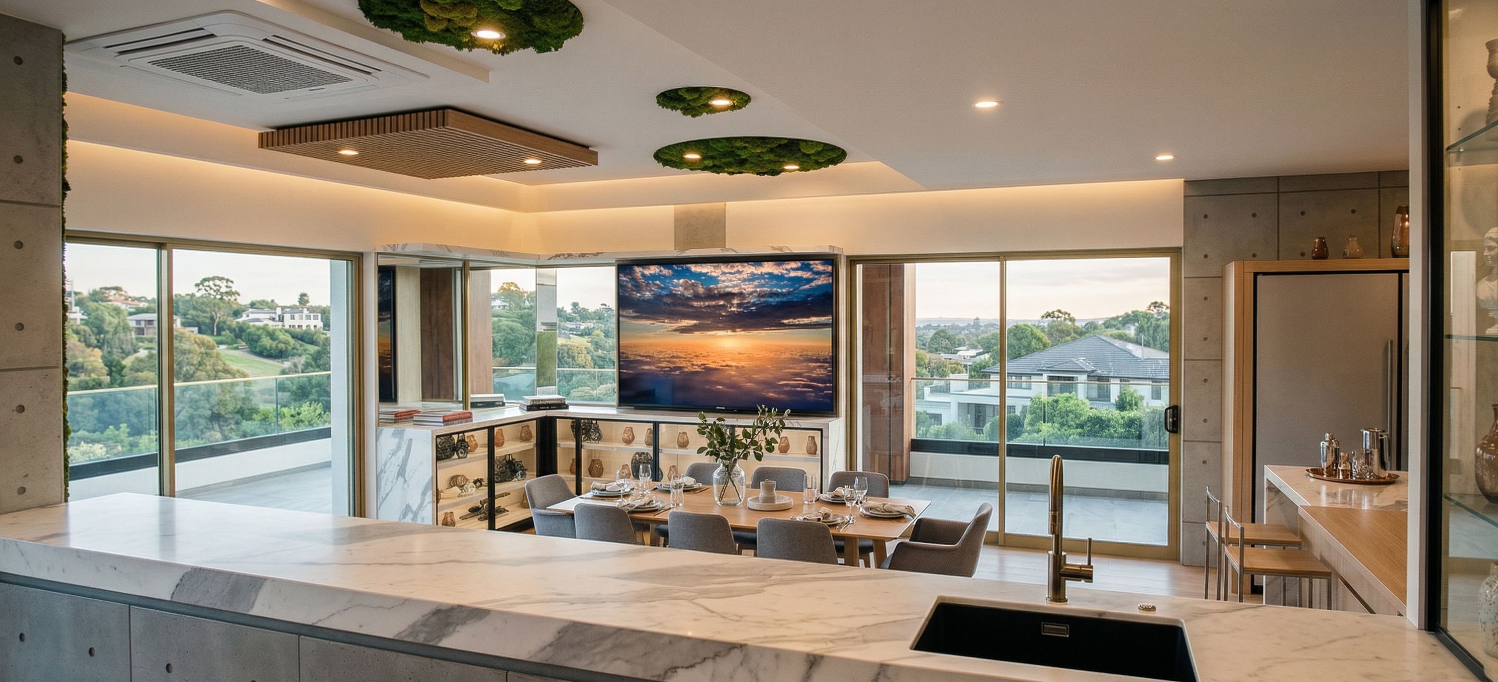 Creates a high resolution highly photorealistic image, type "Professional PHOTO" Use the materials indicated in the picture; the brushy green; the sound-absorbing decorative panels with vertical and horizontal slats in light wood; light white plaster; exposed concrete brick linings with dots. Lounge-style diffused lighting. The green rectangle on the ceiling is a designer white grille air conditioner, on the ceiling., keep exact camera angle. fixtures are brass-steel. externally you can see a green hilly suburban landscape., keep exact camera angle
