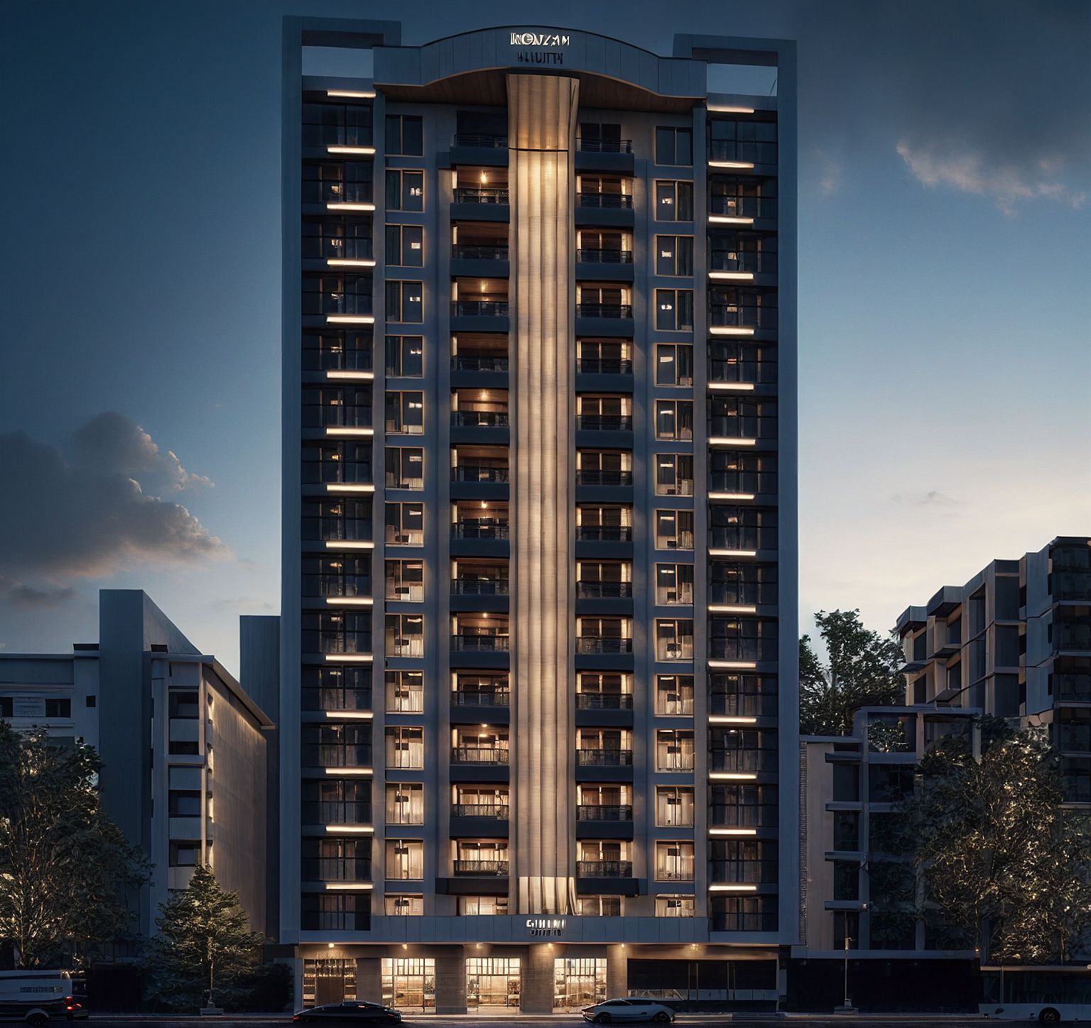 PromptMORNING SKY WITH SOME LIGHTS TURNED ON IN THE BUILDING AND SOME SPOT LIGHTS BELOW THE ROOF CANOPY. PUT SOME SPOT LIGHTS BELOW THE TOP CANOPY. spot lights below the last roof slab along the whole facade.