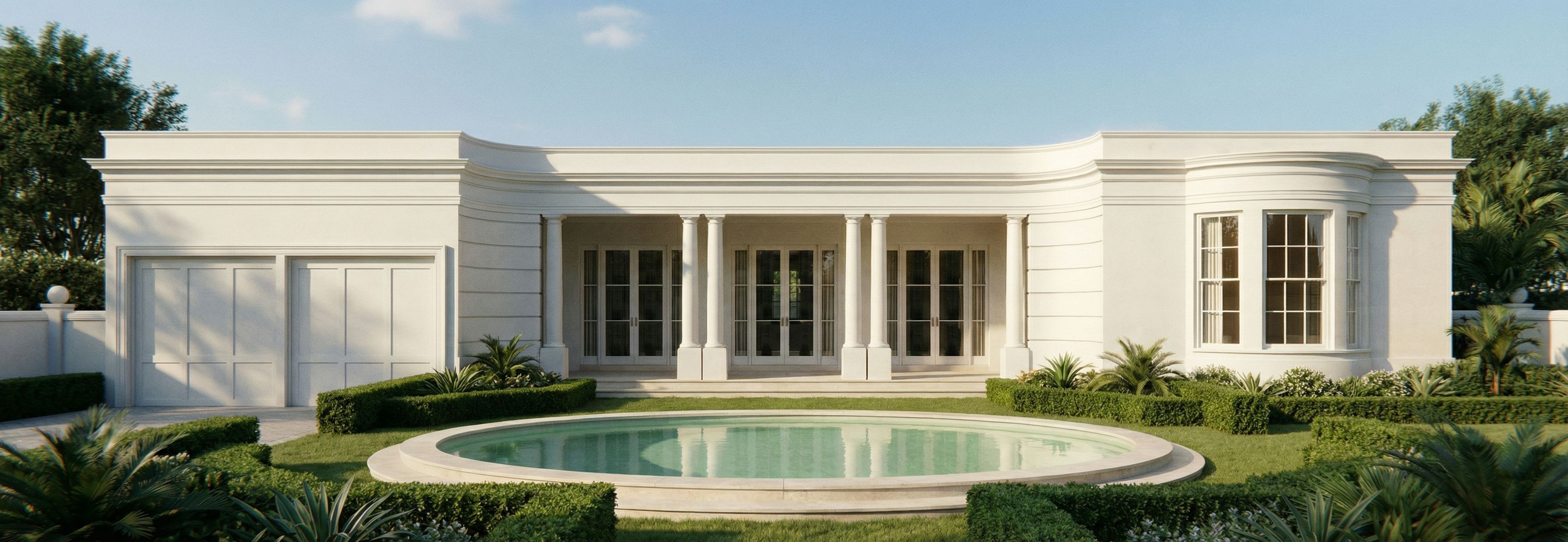 PromptUse the provided rendered image as the base and keep all architecture, camera, lighting, materials, landscape, pool, and proportions exactly the same. ONLY modify the bay window on the right side as follows: Replace the existing bay window with a three-part Regency bay window composition: One larger central window Two narrower flanking windows All three windows are vertically proportioned and aligned The central window is clearly wider than the side windows The bay remains: A semi-circular projection With smooth continuous curvature With the same projection depth as the original HEIGHT (CRITICAL): The bay window must stop below the entablature/parapet There must be visible wall and continuous cornice above it The bay must not extend to full height STYLE (IMPORTANT): Match the elevation drawing exactly in mullion pattern, proportions, and panel layout Classical, refined Regency detailing (not modern, not simplified) 🔒 LOCK EVERYTHING ELSE Do not change: any other windows or doors column spacing curved walls cornice profile pool shape or size landscaping camera angle or lens lighting Everything outside the bay window remains identical., keep exact camera angle
