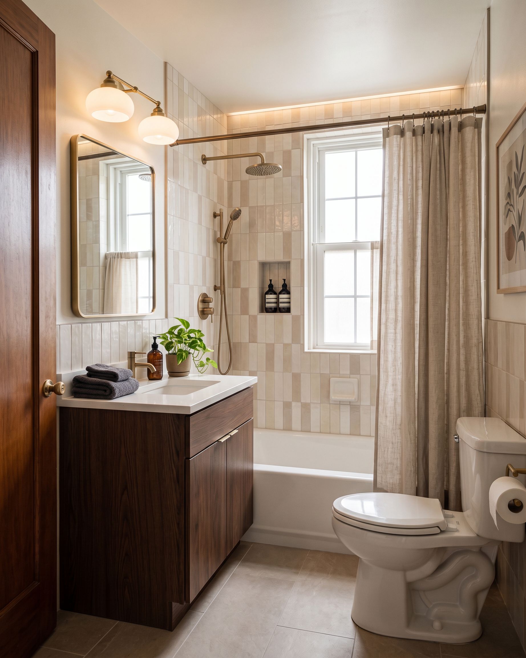 Keep the layout the same in the bathroom. Keep the camera angle the same. Dark wood vanity, soft neutral tiles vertically oriented at the shower surround. The floor to be same color as the neutral tile but 12"x24"., keep exact camera angle