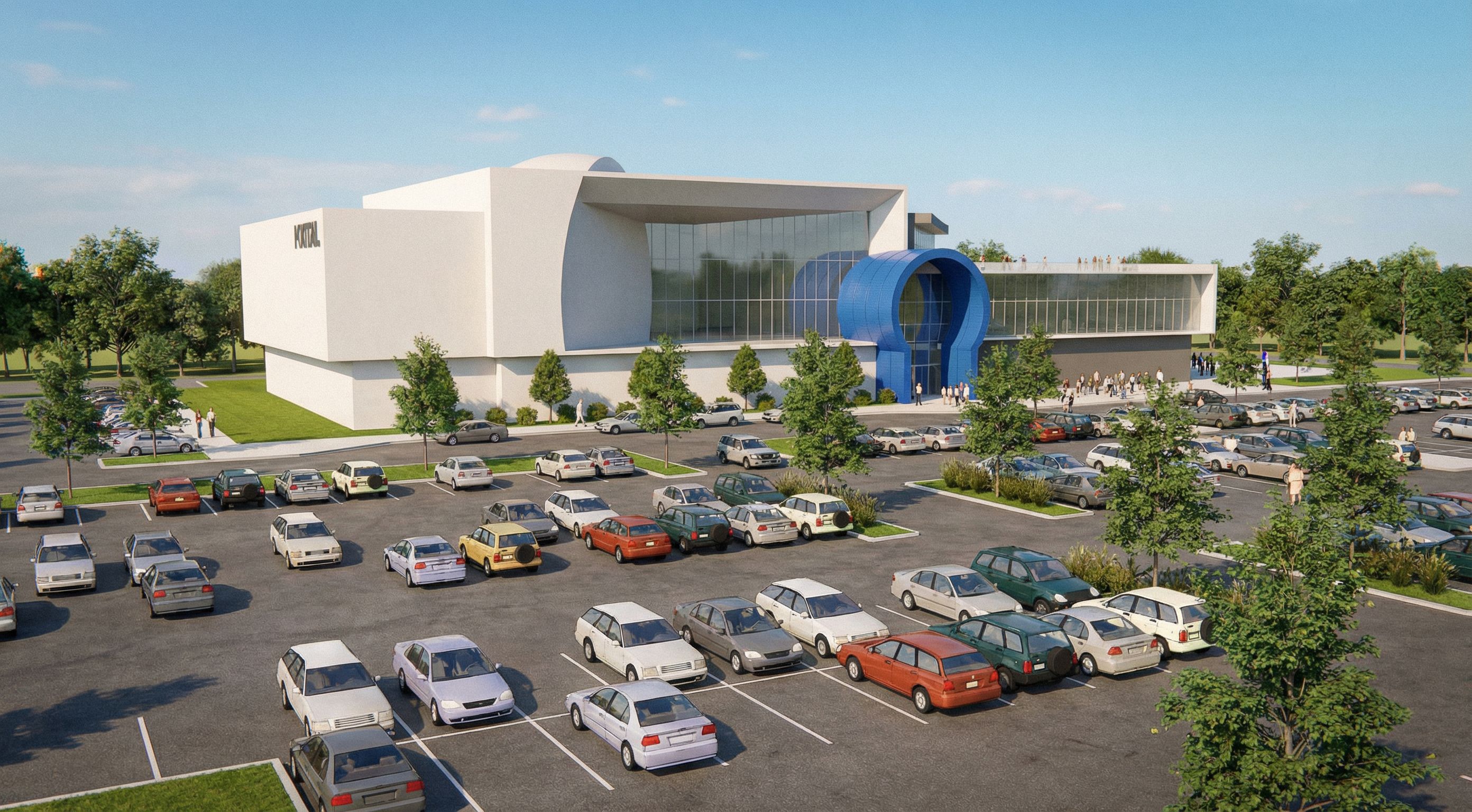 PromptPhoto of a contemporary commercial building featuring smooth, geometric lines and a prominent blue circular entrance. The structure is surrounded by a paved parking lot filled with various vehicles, with landscaped areas including green grass and small trees. Soft sunlight casts gentle shadows across the scene, creating a lively atmosphere. Captured from a high angle with a wide lens to emphasize both the architecture and the bustling environment, showcasing the dynamic interaction between the building and its urban context., keep exact camera angle