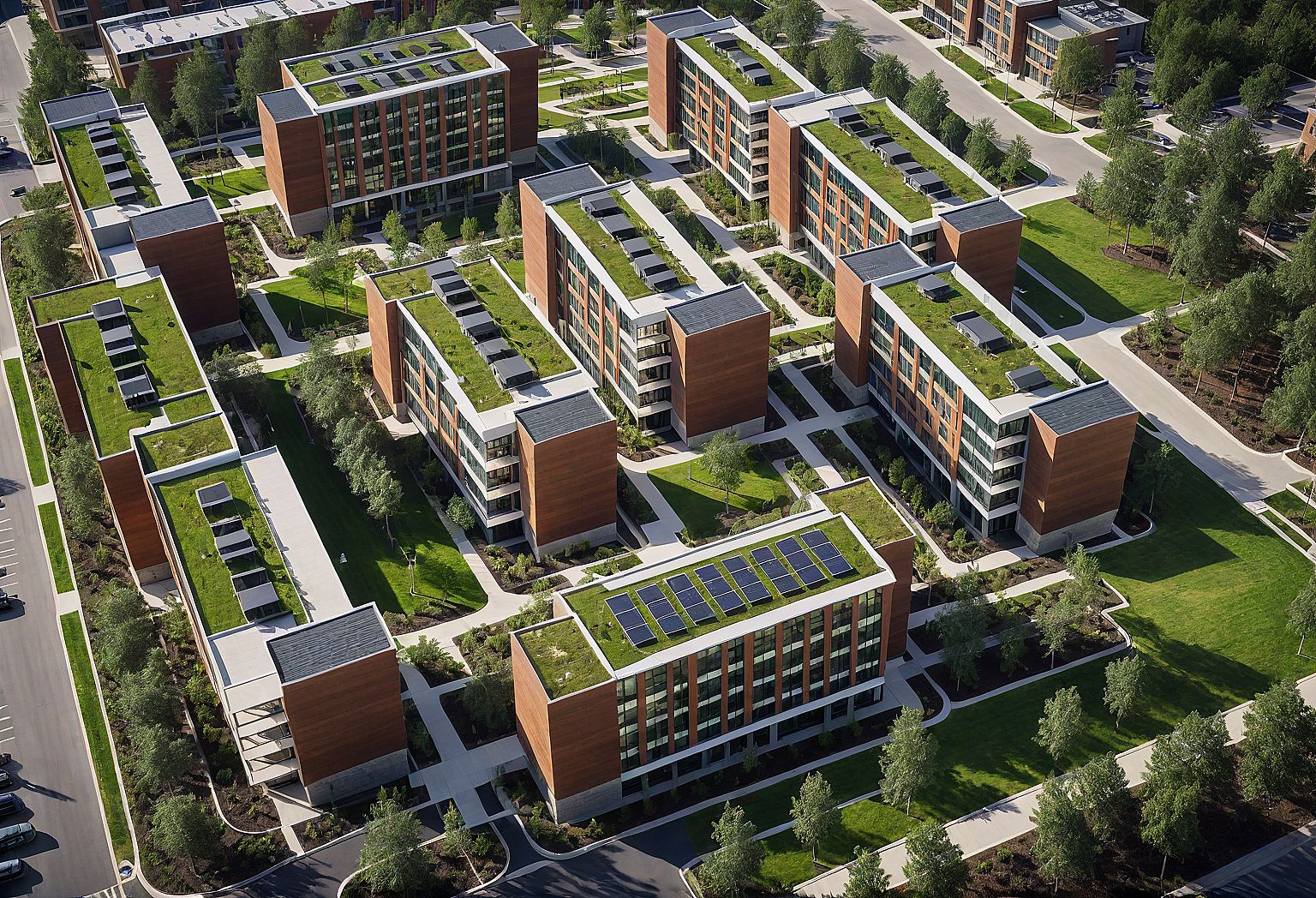 Photo of a modern multi-unit residential-student complex layout featuring, flat roof - interconnected sleek modern design buildings, emphasizing modular design with flat roof and green spaces with pedestrian pathways adjoining the buildings. Architectural details include structured balconies, large windows, and vibrant landscaping with trees and pathways. Urban setting includes parking areas around and surrounding the structures in a suburban context of a university. Optimal natural lighting highlights textures and shadows during late afternoon. Captured from a bird's-eye view with a wide-angle lens, framing the entire complex and showcasing its symmetry and integration with the environment.