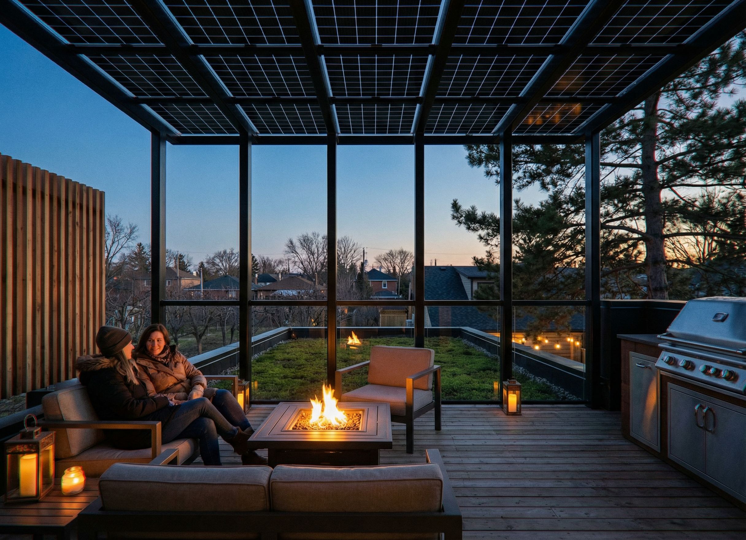 Outdoor wood roof deck, skinny 3 x 3 metal trellis with solar panel roof immediately above, wood privacy screen left side, outdoor patio furniture overlook green roof immediately beyond at same level as deck, over orchard straight ahead and through one tall Scot's pine with branches overlapping green roof to the right, BBQ on right , views to suburban rooftops and trees beyond. Winter with couple sitting with fire table on deck in front of green roof at same elevation as deck. Follow existing axial image geometry - previous image, keep exact camera angle