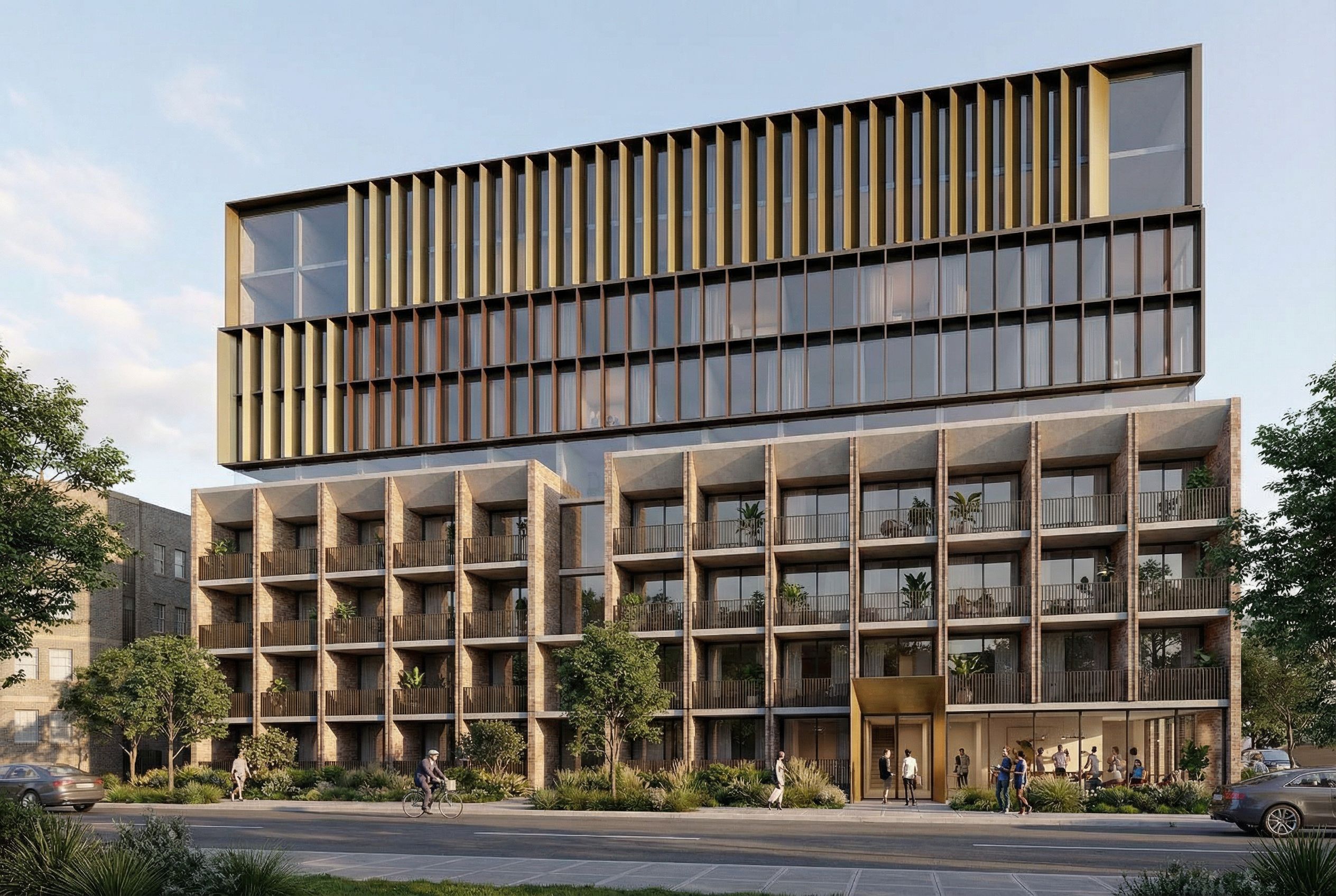 architectural exterior rendering, render this 3D mass into photorealistic rendering, architectural exterior rendering, render this 3D mass into photorealistic rendering, architectural exterior rendering, render this 3D mass into photorealistic rendering, Do not change the 3D massing image provided and do not change the camera viewpoint. Include the full extent of the roof line in the render. The building is located at 16-24 school parade, Marrickville NSW. Use brick as per reference image. The horizontal slabs shown as light gray in the image to be concrete. Metal trim is brass and dark bronze as indicated. The vertical walls within the grid have brick edges. There is a 3m front setback and 3m side setbacks, include australian natuve landscaping in the 3m front setback. Include some street trees. At ground floor there is the building entry with a brass shroud and to the right of this is communal living space with glazing, populate the communal living space with people and show several people entering the building. Include several pot plants on the balconies behind the balustrades. The facade is facing East, include low morning light hitting the facade., eye level view, bright daylight, natural lighting, including people, vehicles, greenery and vegetation, trees, high quality, professional, detailed scene