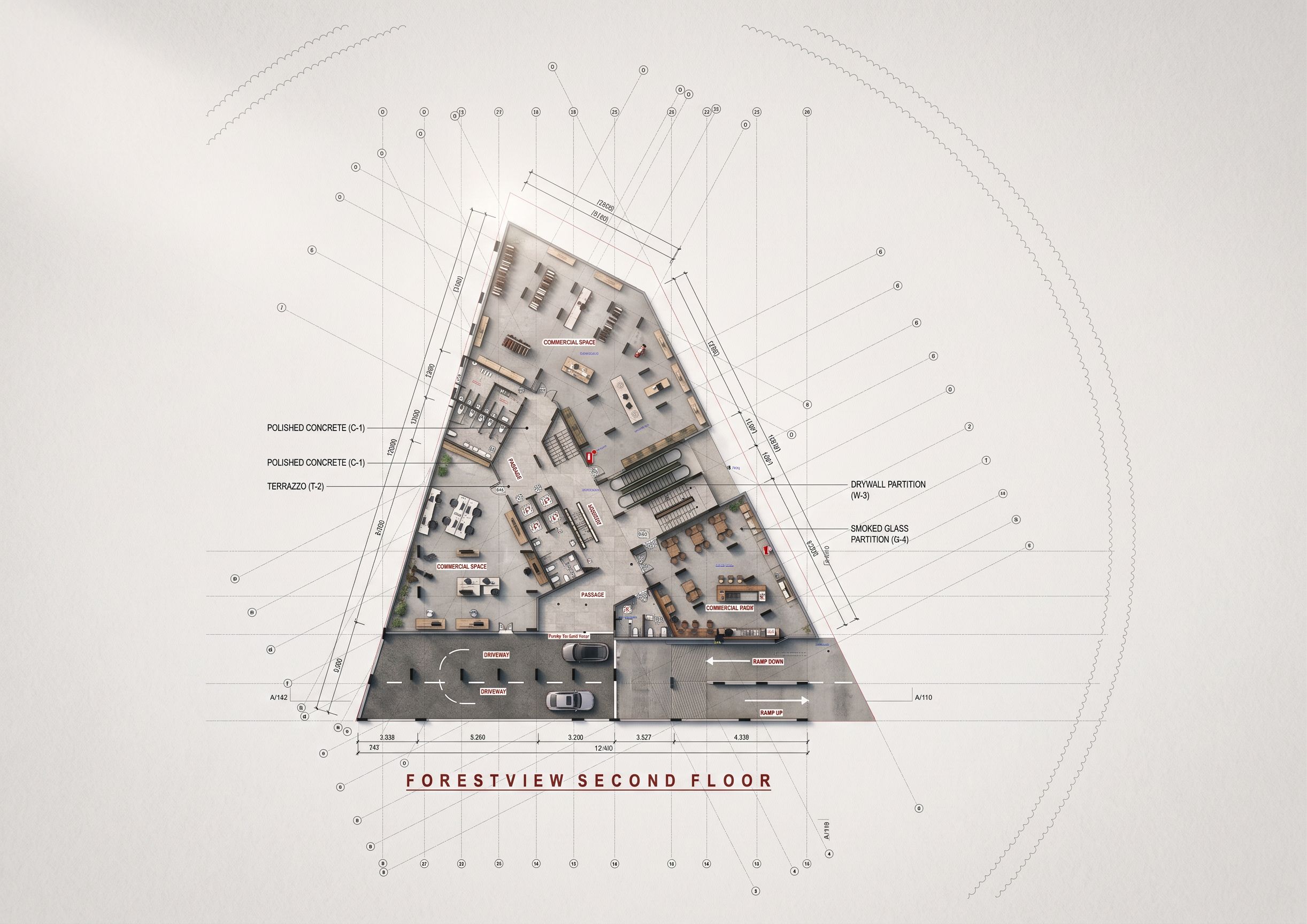 LAYOUT SHOWING A COMMERCIAL FLOOR WITH SHOPS AND LARGE COMMERCIAL SPACES, CIRCULATION SPAces and washrooms. ACCESS RAMPS. CLEARLY INDICATE PARTITIONS AND ANNOTATIONS. MAKE IMAGE HIGH RESOLUTION 8K. MAKE LAYOUT HIGH RESOLUTION AND REALISTIC., keep exact camera angle