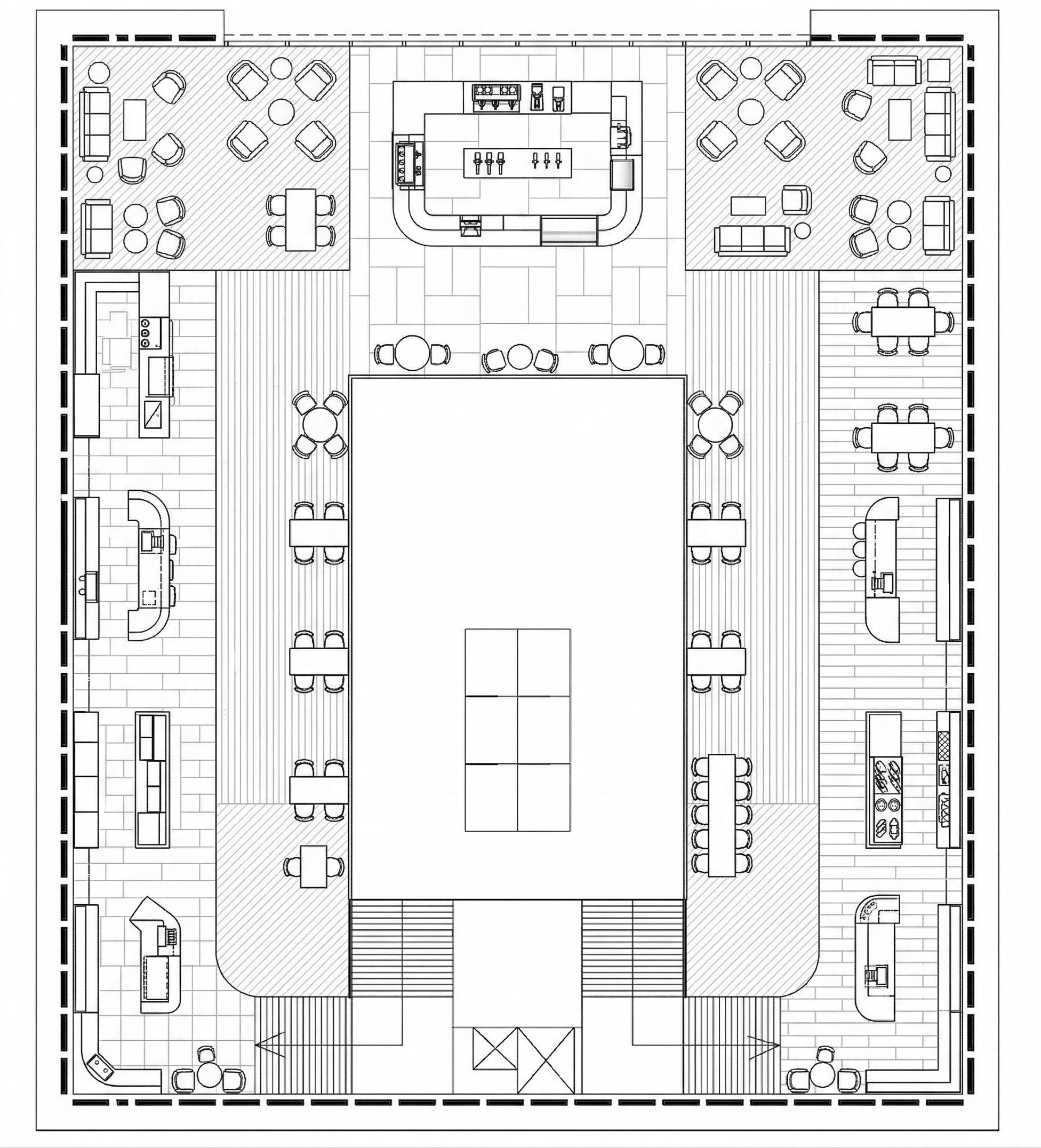 PromptRefine the upper floor (mezzanine gallery) of this market hall. Treat only the hatched area as the second floor. Keep the original building shape, symmetry, and layout strictly unchanged. The upper level is a partial mezzanine (gallery) with a central open void overlooking the ground floor Do not add walls or enclosed rooms — keep the space fully open Organize the space as a relaxation and refreshment zone with market character Include: small food stalls / counters (market-style) coffee bar / drink bar seating areas (tables, chairs, lounge seating) Arrange everything using furniture and light stall structures only, not solid partitions Keep the layout clear, structured, and readable, similar to a traditional market organization Maintain symmetry and main circulation logic from the original plan Circulation should follow the gallery edge (loop) Orient the main seating and food areas toward the top side of the drawing, facing the glass façade and river view Balance between stalls and open seating space — do not overcrowd Drawing style: clean AutoCAD-style architectural floor plan, black and white, thin precise linework, minimal shading, clear line hierarchy, no perspective, no text labels ...no walls no partitions, only organization through furniture, keep exact camera angle