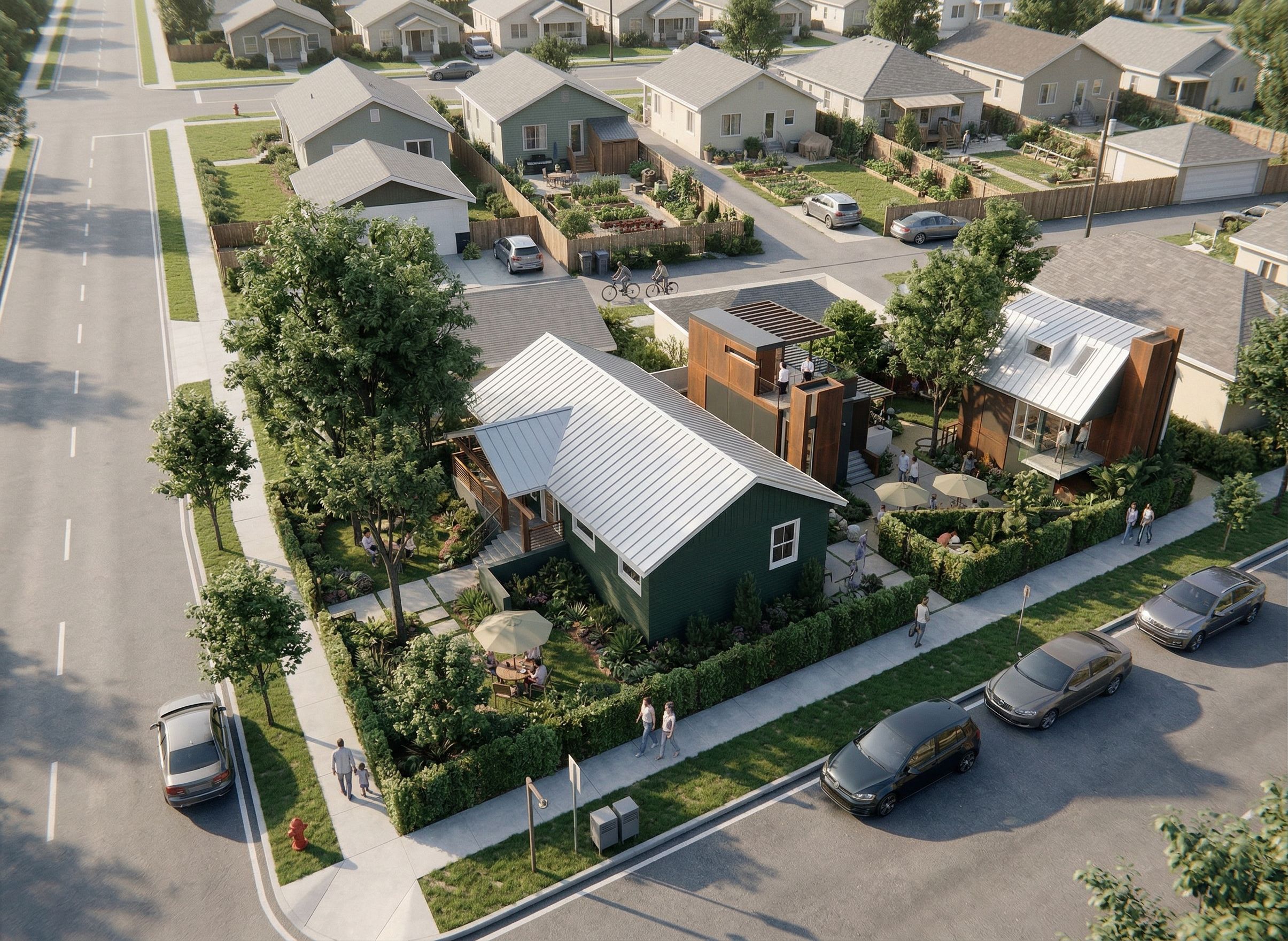 now use same images but turn background of the lane, back yards and houses perpendicular to the current image at the back unit The street in front of the house on the left extends beyond the house. remove dimensions remove rusted steel fences remove stone walls keep landscaping show back yards of bungalows beyond