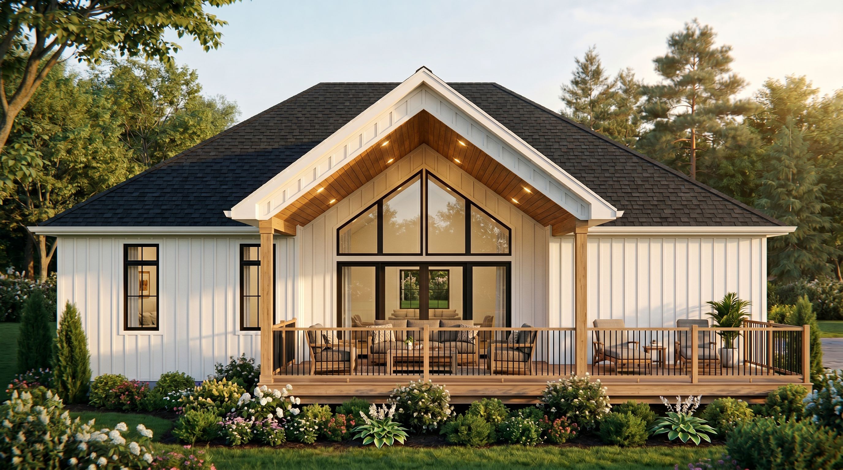 A photo of a covered rear deck, the middle part of the deck has a roof and the right side is a sun deck, show the windows on the left rear side only as shown, show railings with black spindles, white vertical siding, black shingle roof, landscaping and plants in front of the deck, the reference photo attached is the front of this home, please use the same elements and style, no gable beam or brackets, so furniture, attach the windows to the patio door, no spacing, wood posts and wood ceiling, no stone at rear, no roof over deck on the right side, connect the triangle windows to the patio door there should be no white trim between the two, show deck furniture, keep exact camera angle