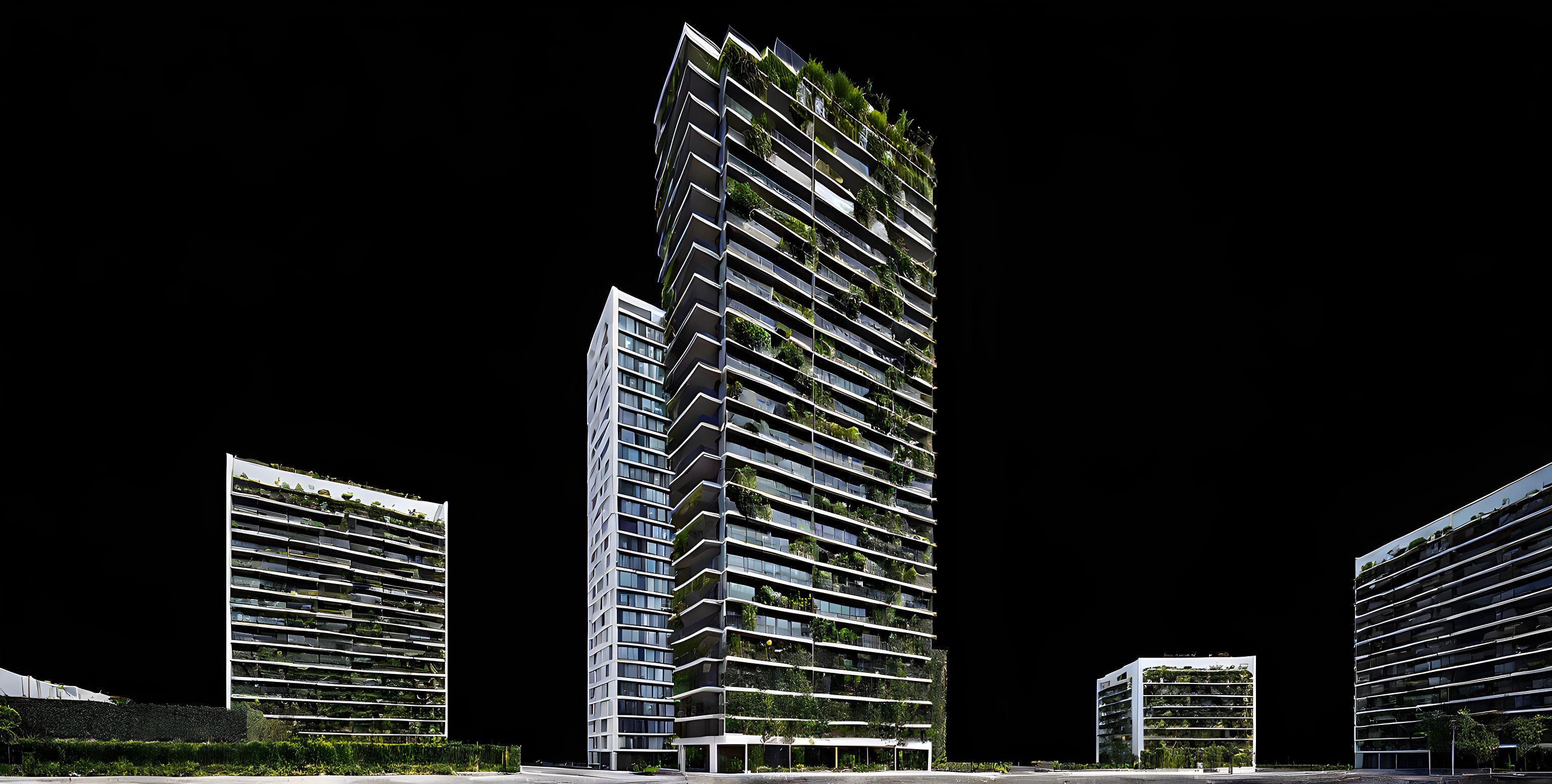PromptCreate a modern skyscraper with a sleek, dark-toned facade and a series of staggered balconies. The building features lush greenery exclusively on the front-facing facade, creating a vertical garden that contrasts with the minimalist architecture. The backdrop is a bright, clear sky, and the scene is framed by natural surroundings. Use a color palette of deep facade tones, vibrant greens from the plants, and soft blues from the sky to highlight the harmony between urban form and nature.