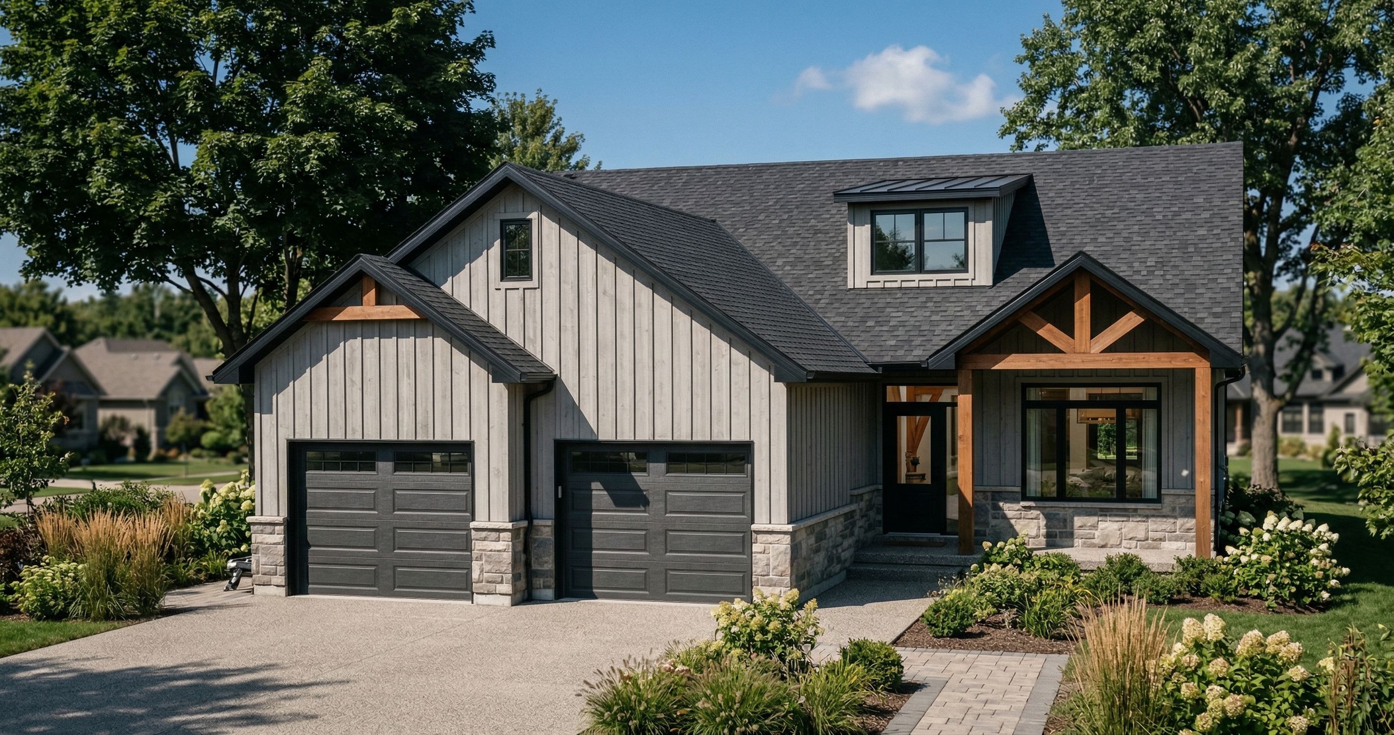 PromptPhoto of a modern two-story residence featuring a gabled roof, vertical wood siding, and stone accents around the foundation. The design includes large windows framed in black, providing a contemporary aesthetic with natural light. Surrounded by a suburban neighborhood, populated with similar homes and green landscaping. Bright daylight casts soft shadows, enhancing the textures of the materials. Captured from a slightly elevated angle, using a 35mm lens to emphasize the structure's prominent features and inviting entrance., keep exact camera angle