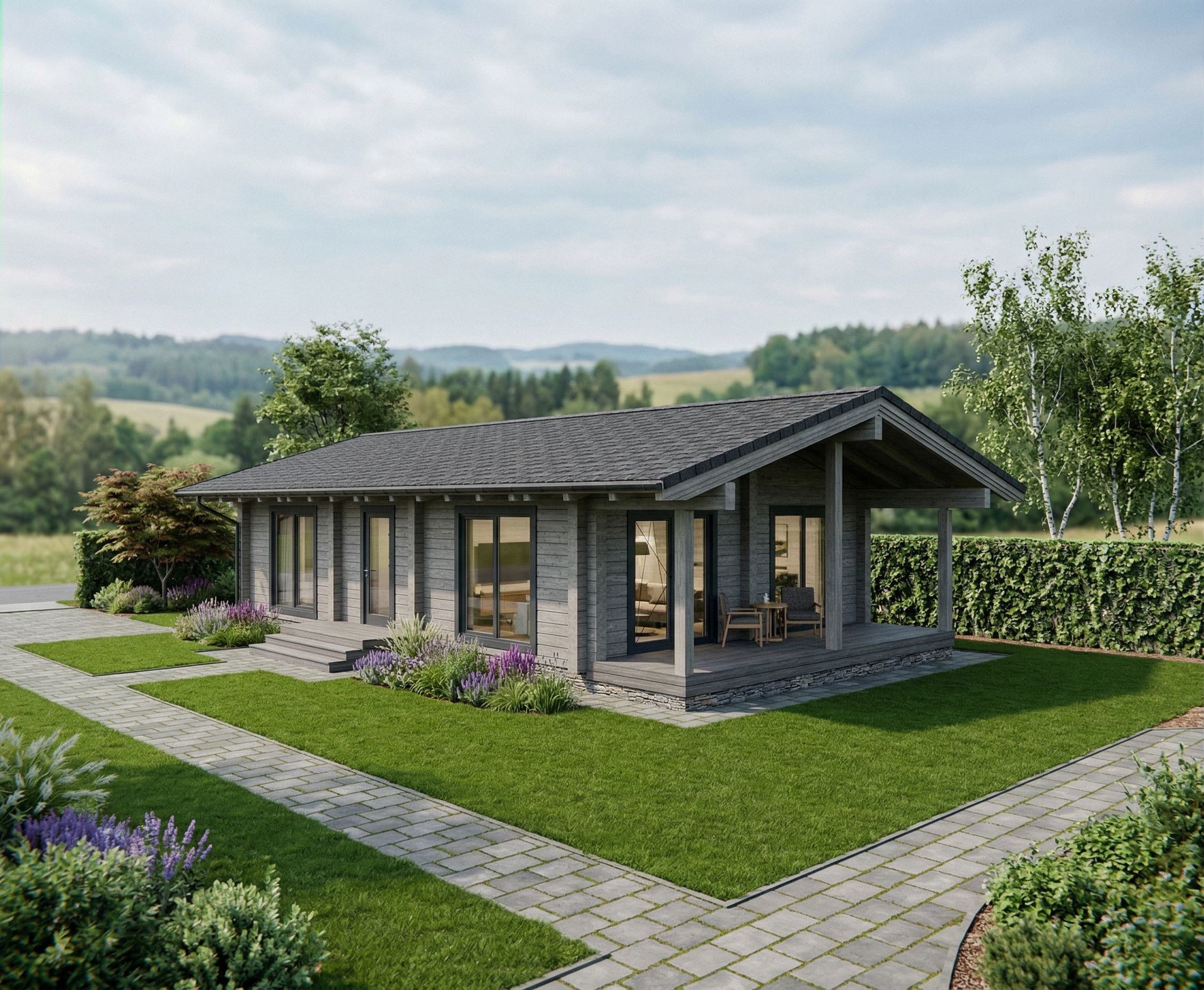 Prompta gray glued-lumber house with dark platbands and a foundationr, keep exact camera angle