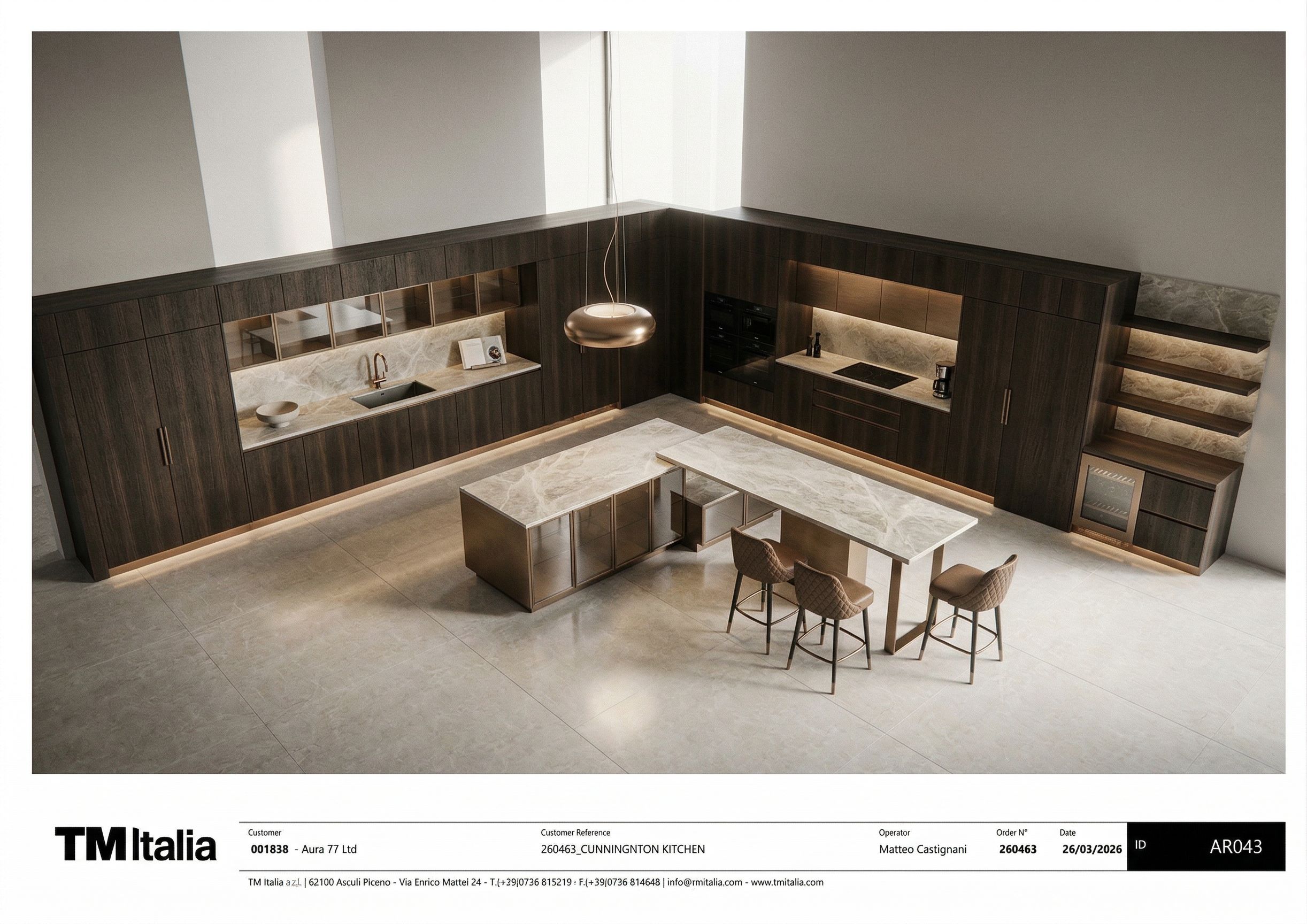 please render exactly like the file with the same finishes specified on the drawing on the files, attacheed yu will find the finishes specified. add the worktop. finishes cabinest in red are termocotto, the grey uits are bronze the glass units with bronze profile and clear glass and the floor 120x120 in pulpis and top and splash back in pulpis. The owns and hob miele black glass, tap from gessi bronze and sink gun metal, stools leather diamond shape where the breakfas bar is, add a lamp over the island , keep exact camera angle