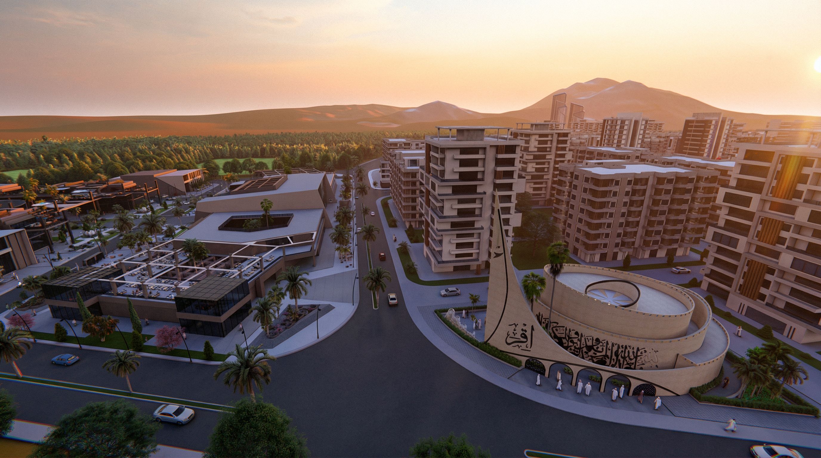 PromptPhoto of a contemporary MOSQUE ON THE RIGHT, highlighted by smooth concrete surfaces and intricate calligraphy detailing on its façade. Surrounding, modern residential structures feature varying textures and materials, creating a rich urban landscape. Palm trees line the street, enhancing the OASIS feel. The scene is bathed in warm golden hour light, casting soft shadows and illuminating the building's architectural features. Captured from an aerial perspective with a wide-angle lens to encompass the harmonious integration of structure and environment, emphasizing depth and spatial relationships.