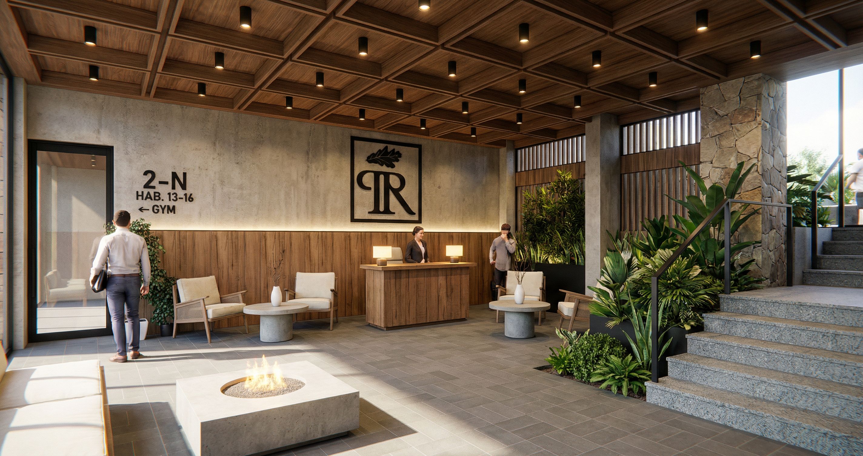 High-end photorealistic boutique hotel motor lobby, warm and sophisticated arrival experience. Gray 7x30 cm tile floor and granite-style stairs, natural matte walnut wood ceiling in grid layout with 10 cm black tubular lights at intersections, soft warm hospitality lighting. Local San Cristóbal flagstone columns, matte black metal railings and hardware. Aged concrete, modern plants, curated green area beside stairs. Low-profile aged concrete fire pit with subtle glow. Natural matte walnut wood wall paneling. Cinematic lighting, global illumination, realistic materials, soft shadows, ambient occlusion, wide-angle architectural lens, eye-level, ultra-high resolution.show the entire area of ​​the uploaded image