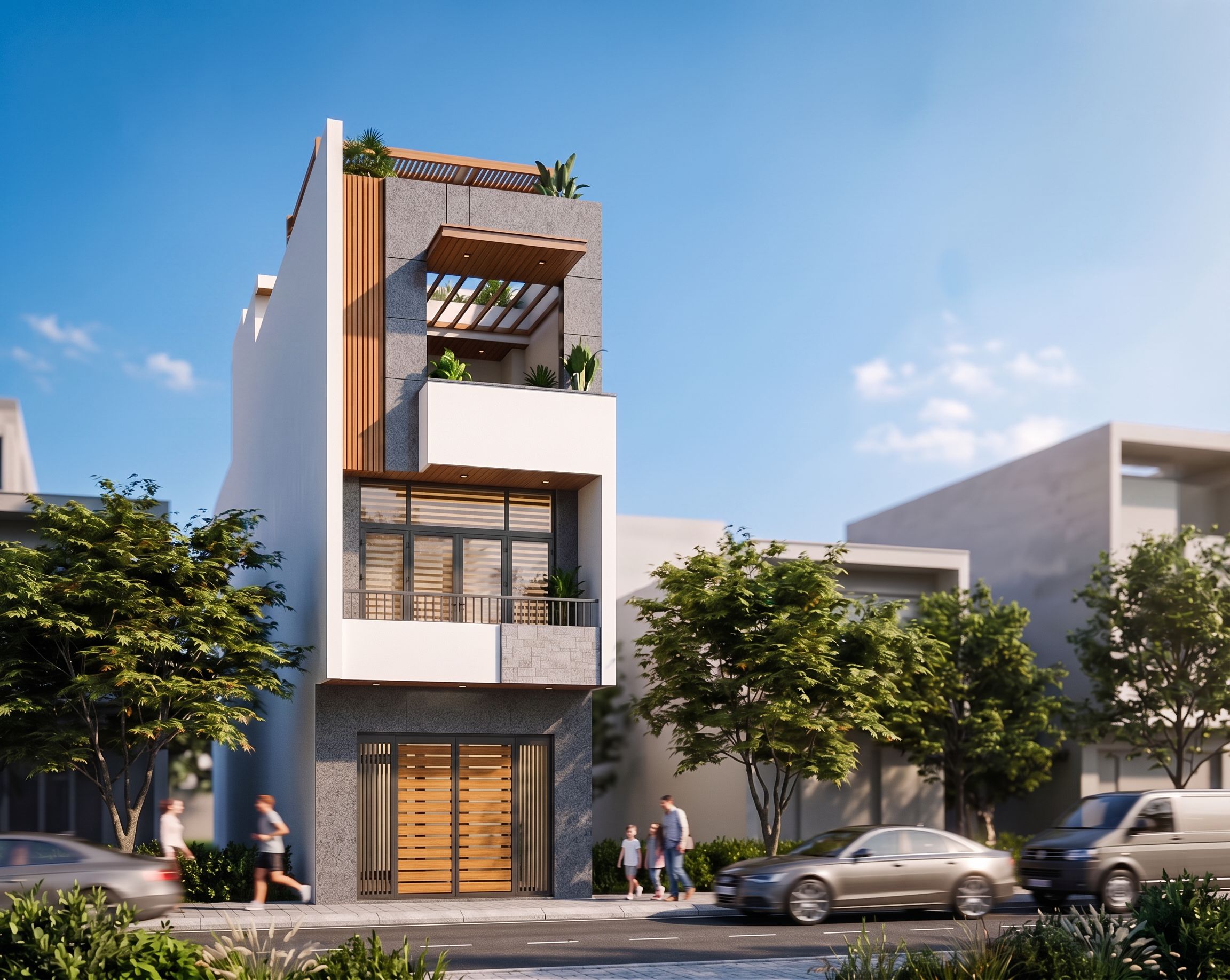 PromptThis photograph captures a modern multi-story apartment building, harmoniously blending matte white walls with a subtle, textured natural gray stone finish. Black-painted iron balcony railings, set against a backdrop of potted plants, highlight the contemporary architectural details. Situated in an urban environment surrounded by low-rise buildings and lush greenery, the building creates a vibrant streetscape. The image was taken in the bright afternoon sun, creating striking shadows and highlights on the facade. The original angle and design are preserved. A low angle is used to emphasize the height and design elements, mimicking a wide-angle lens to create an impressive and dynamic scene., keep exact camera angle