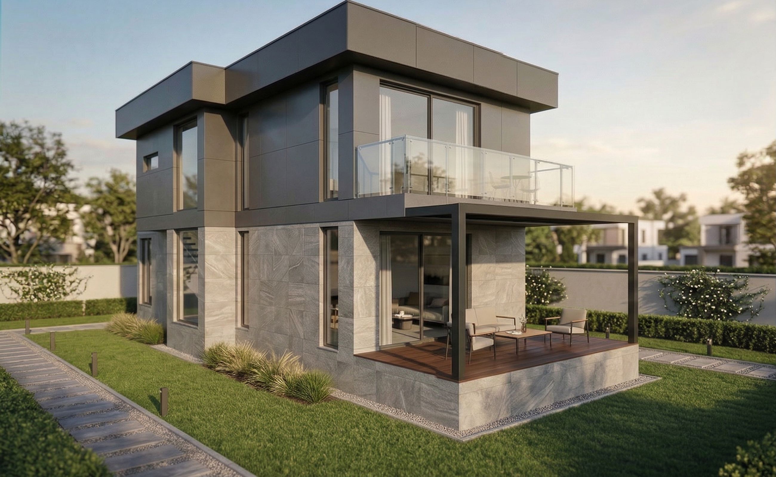 PromptPhoto of a modern two-story house featuring a flat roof and a mix of textured materials. The building showcases large glass windows with sleek frames, a balcony, and a covered patio. Surrounding the house is a landscaped garden with well-maintained grass and a tidy walkway. Soft, natural sunlight casts gentle shadows, enhancing the architectural details. Captured from a low angle, the lens emphasizes the house's height and contemporary design elements, with a slight depth of field focusing on the facade while blurring the distant background. do not change form .upper floor covered with dark grey ceramic material. Dark grey window frame, keep exact camera angle