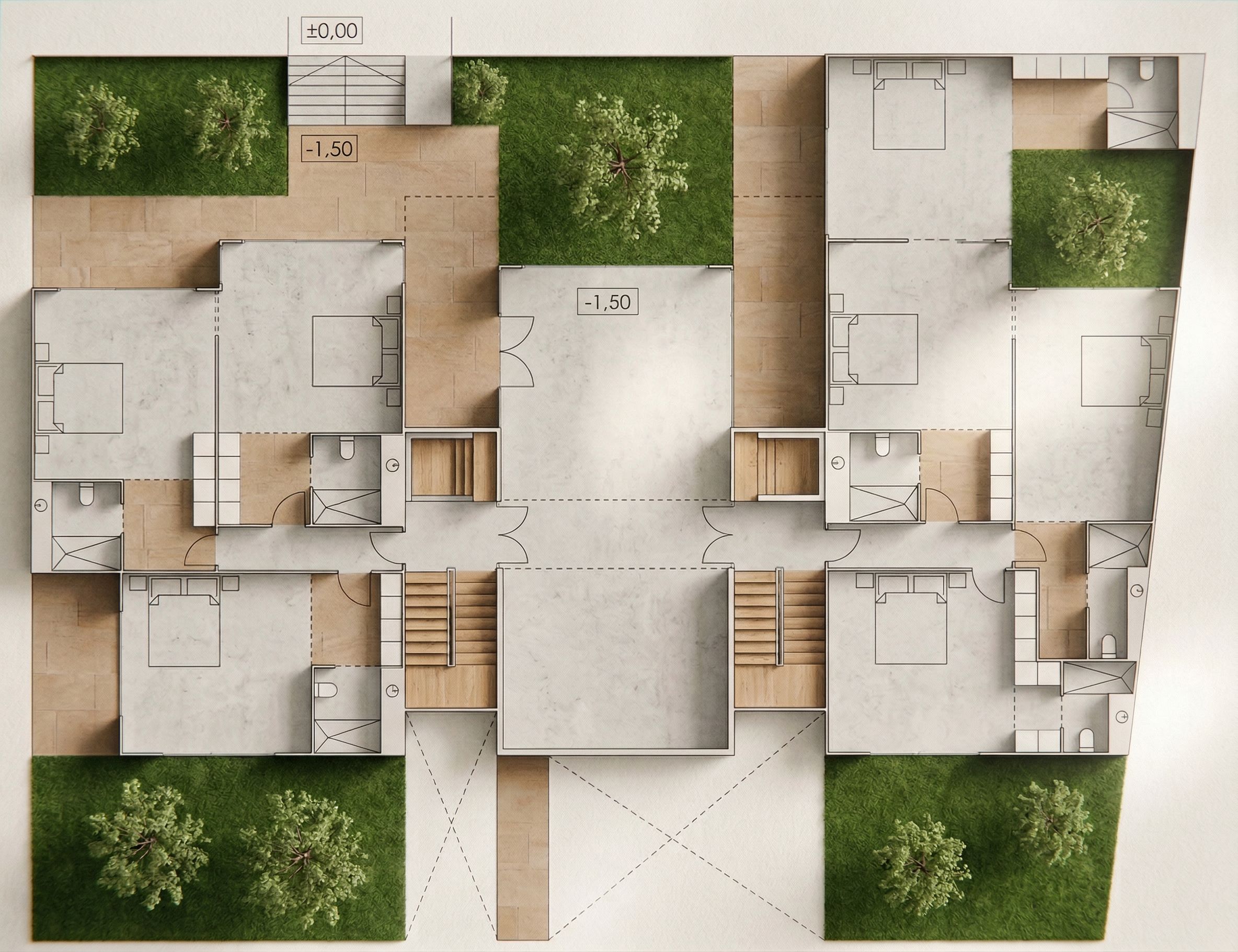 PromptPlano realista con colores suaves. Respetar las volumetrías y la distribución de la planta. Todo lo verde son patios con césped, no interpretes, no hay agua , keep exact camera angle