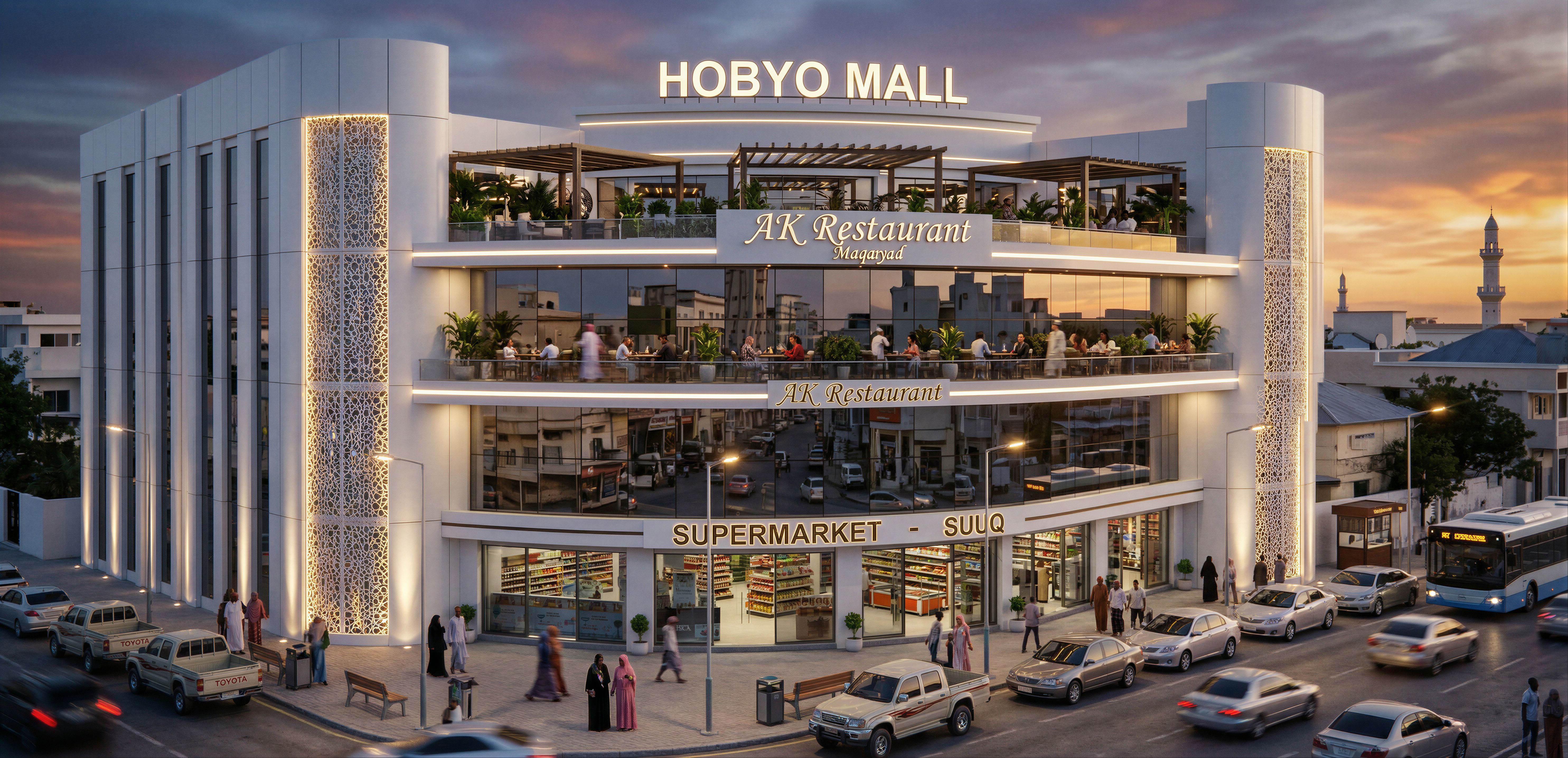 Commercial mall in Mogadishu Somalia. Make the glass realistic and reflective. Ground floor Supermarket and shops. First floor Restaurant with a balcony overlooking the road. Use white aluminium composite panels on the building . PUT PEOPLE OF SOMALI ORIGIN ON THE STREET. INCLUDE SOME SPOT LIGHTS, ROPE LIGHT AND STREET LIGHTS ON THE BUILDING. MAKE IMAGE HIGH RESOLUTION 8K. PUT NAME "HOBYO MALL" ON THE TOP PART OF THE BUILDING. PUT THE NAME "AK Restaurant " on the roof top restaurant facing the road., keep exact camera angle