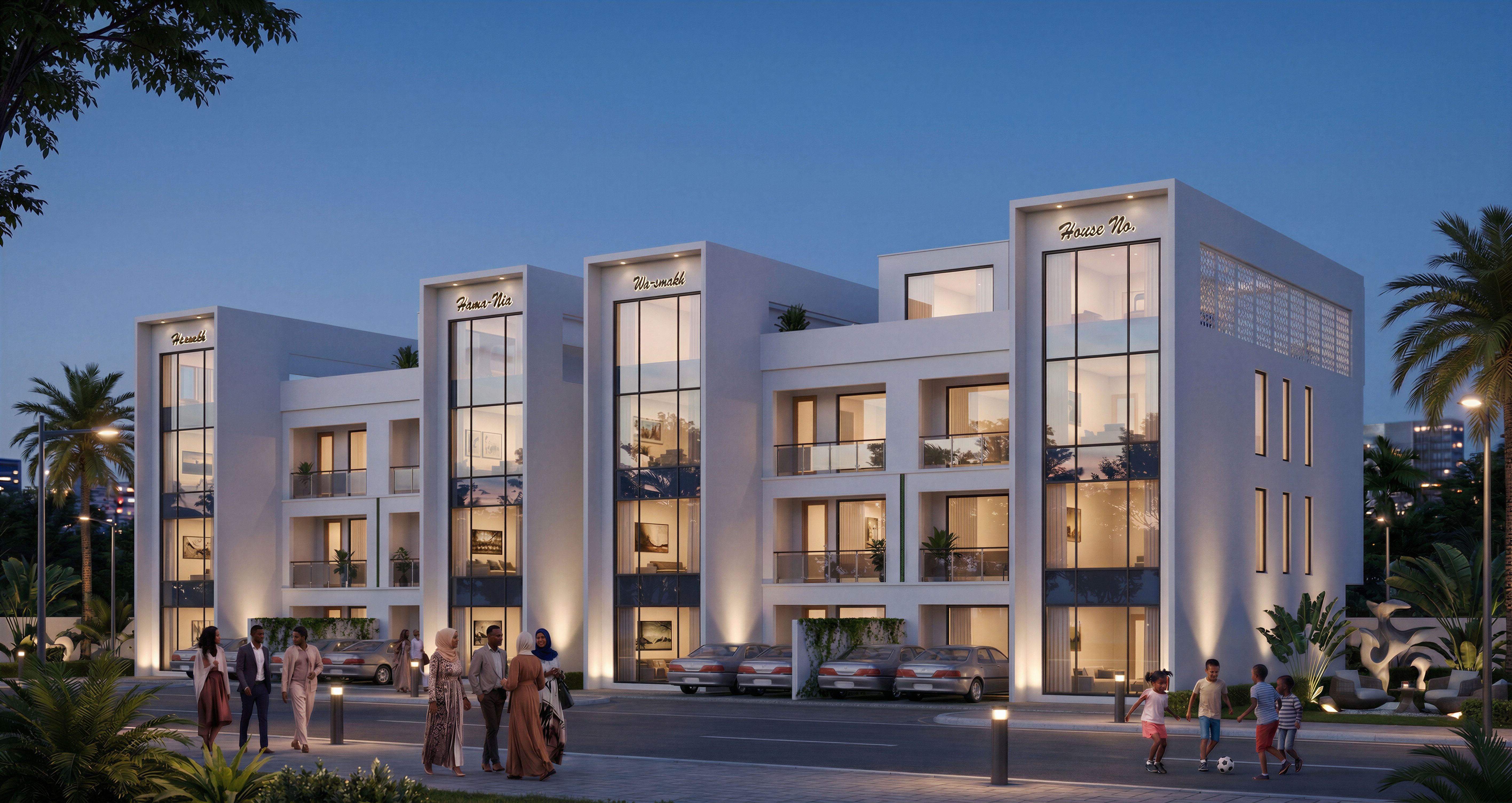 EnhancedPrompt VIEW OF AN EXCLUSIVE HIGH END ESATE . USE BRILLIANT WHITE WALL MASTER ON THE BUILDING.MAKE THE GLASS REFLECTIVE AND REALISTIC . INCLUDE ROADS, GARDENS, CHILDREN PLAYING. ADULTS OF SOMALI AND AFRICAN ORIGIN WALKING ON THE STREETS. SITTING AREAS AND LANDSCAPING. USE BRILLIANT WHITE WALL MASTER ON BUILDING AND MAKE IMAGE HIGH RESOLUTION 8K. INCLUDE SOME GARDEN LIGHT, SPOT LIGHTS AND STREET LIGHTS. TURN ON THE LIGHTS. COVER THE TOP OPENING ON THE SIDE WITH ARABIC MSHRYABIYA.MAKE MASHRYABIYA WHITE AND WITH BIGGER SPACING AND PUT IT ONLY ON THE SIDE. MAINTAIN THE LONG WINDOW IN THE FRONT FACADE BUT MASHRYABIYA ON THE LONG OPENING ON THE SIDE AT THE TOP.INCLUDE SOME CREEPERS ON THE SEPERATING WALL AT THE PARKING., keep exact camera angle