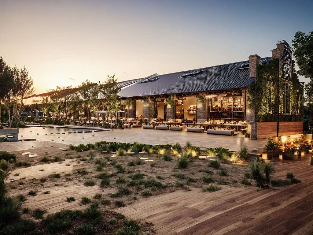 food hall, amazing garden, same construction materials, same facade, amazing terrace, sunset