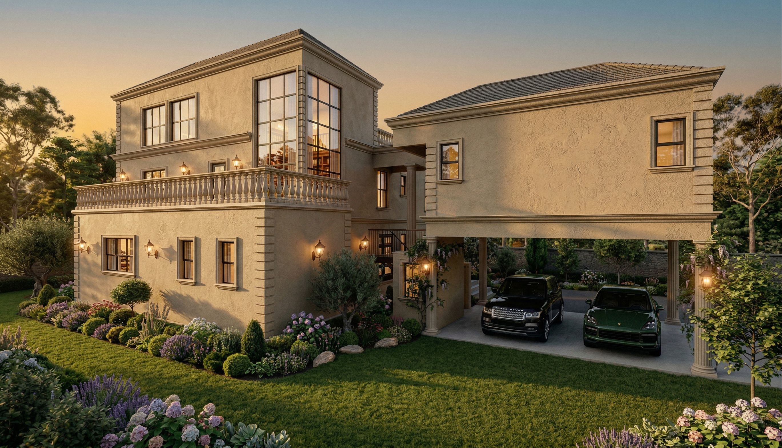 Transform this render into a realistic image with textured beige walls and premium cars in the car port, keep exact camera angle, keep exact camera angle