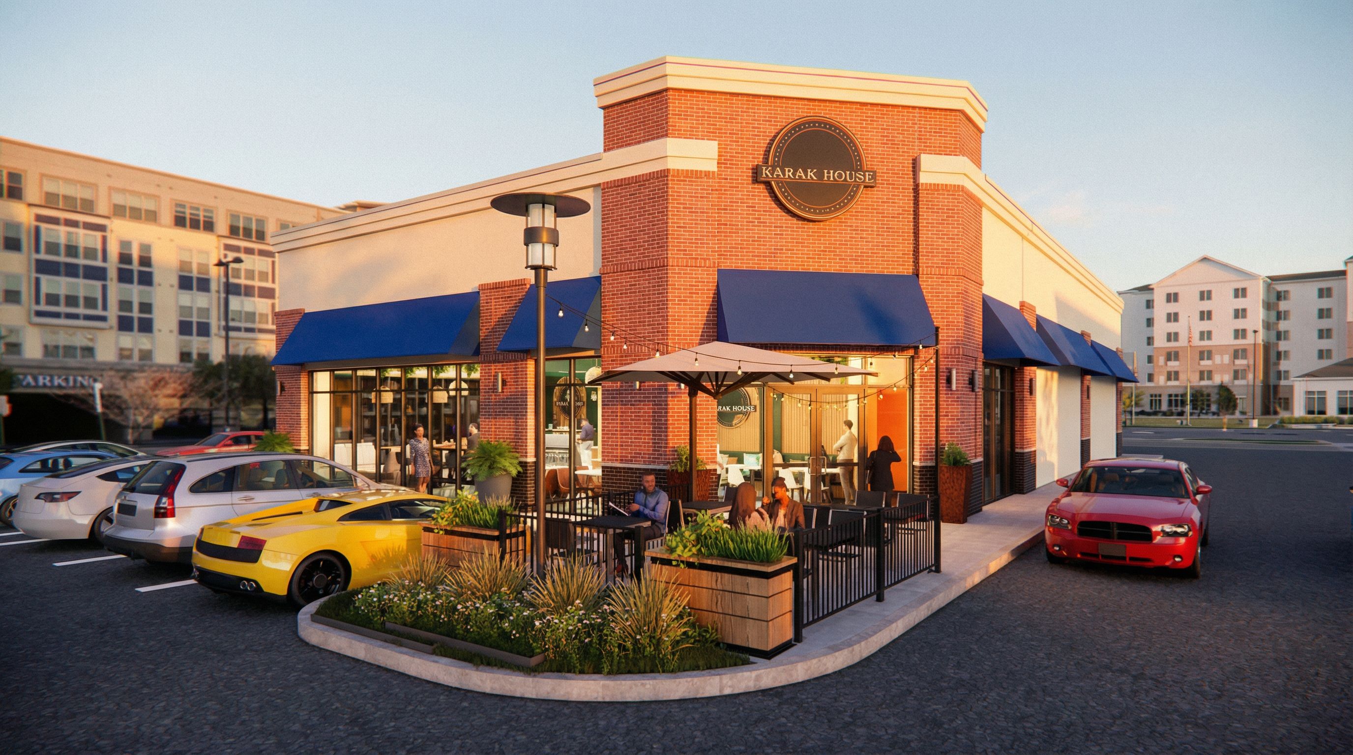 Photo of a contemporary restaurant with a brick facade, featuring large glass windows and a prominent awning. Highlight vibrant outdoor seating areas surrounded by lush greenery. The urban setting includes nearby multifamily residential buildings and a bustling parking lot with various cars. The scene is illuminated by soft twilight lighting, creating gentle shadows and warm highlights, emphasizing the inviting atmosphere. Capture a low-angle perspective to enhance the restaurant's stature, with a focus on lens specifications that convey depth and a clear view of the surroundings., keep exact camera angle