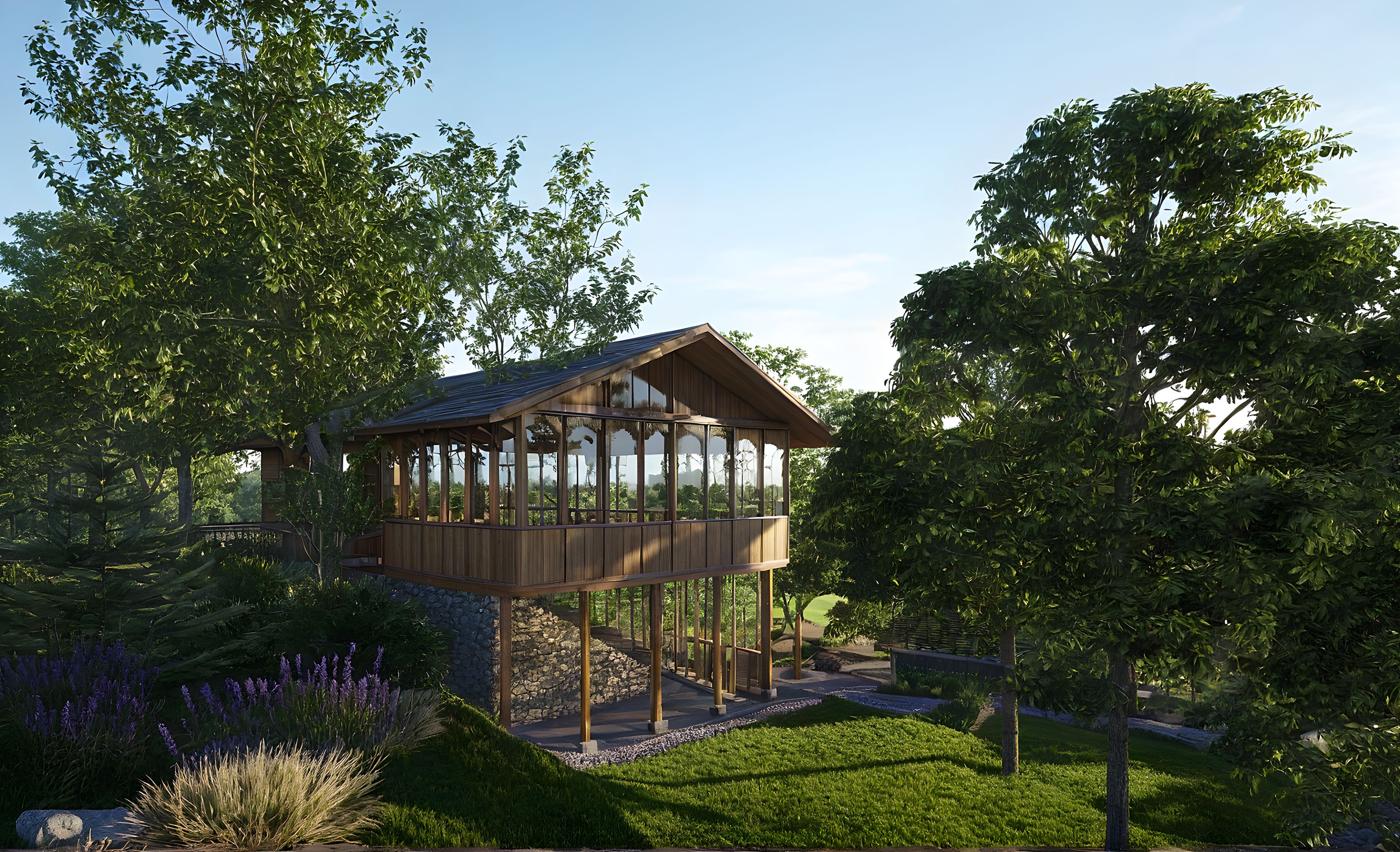 PromptCreate a hyper-realistic morning render of a raised, glass-enclosed pavilion set within a carefully landscaped hillside. The structure, featuring warm wooden framing, arched window panels, and a textured stone base, should remain exactly as shown. Preserve the surrounding planting design: manicured grass, pockets of ornamental grasses and lavender, and tall forest trees with light dappling through the canopy. Emphasize a clear, inviting morning atmosphere with golden sunlight grazing across the pavilion’s wooden surfaces and the upper foliage, creating soft shadows and a warm glow inside the glassed lounge. Show gravel detailing along the pavilion base and steps, and maintain the sense of peaceful elevation, with subtle glimpses of the landscape beyond. The composition should balance human-made elegance and natural calm, avoiding visual clutter or wild overgrowth. Keep all material textures, vegetation choices, and color tones as in the original image—no stylization.