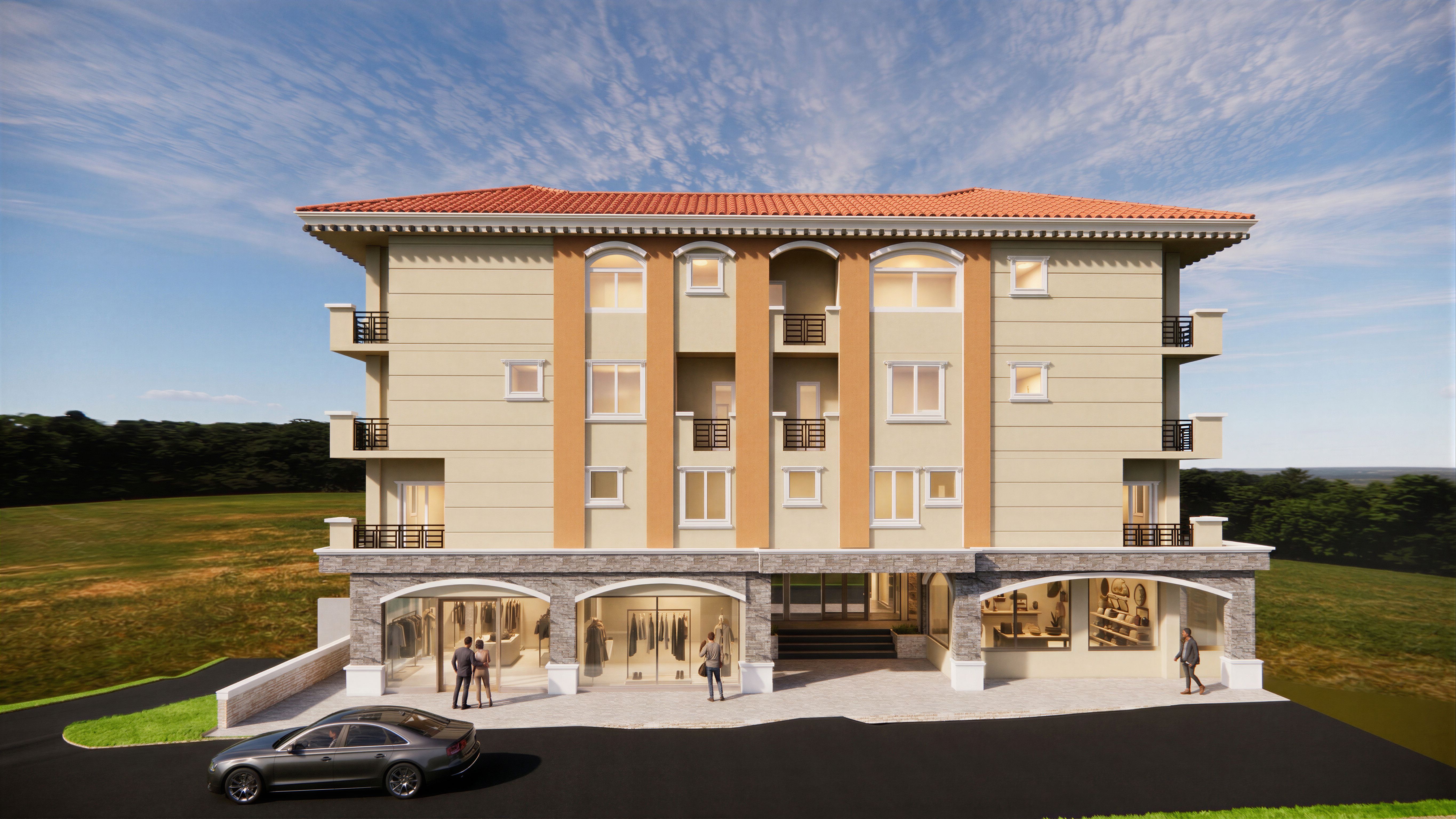 EnhancedPromptin this render, the ground floor has shops and the upper floors have apartments. in this render, add some subtle warm light coming from each apartment and is visible through the glass. dont make any changes to the background of the render. add some subtle warm lighting inside the shops on the ground floor, show one car using the access road which is the black road. populate the render with some 4 people on the ground floor where the shops are. dont add plants on any balcony. keep the roof finishing a neat clean red tiling finish. dont add anything in the background and to the sides of the building, keep it as it is in the image, keep exact camera angle