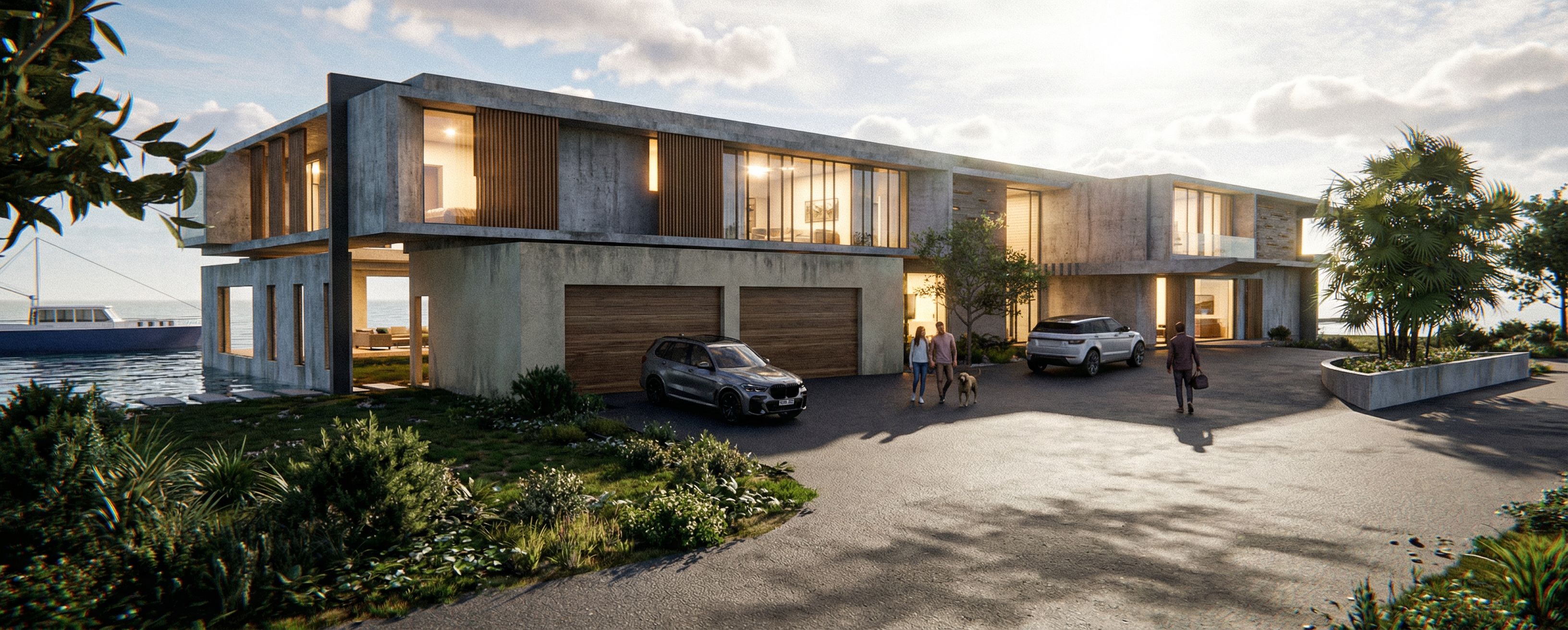 create hyper realistic render of a modern house. sunny day with some clouds. keep the exact point of view. add high definition people walking around. realistic ilumination inside the house . , keep exact camera angle