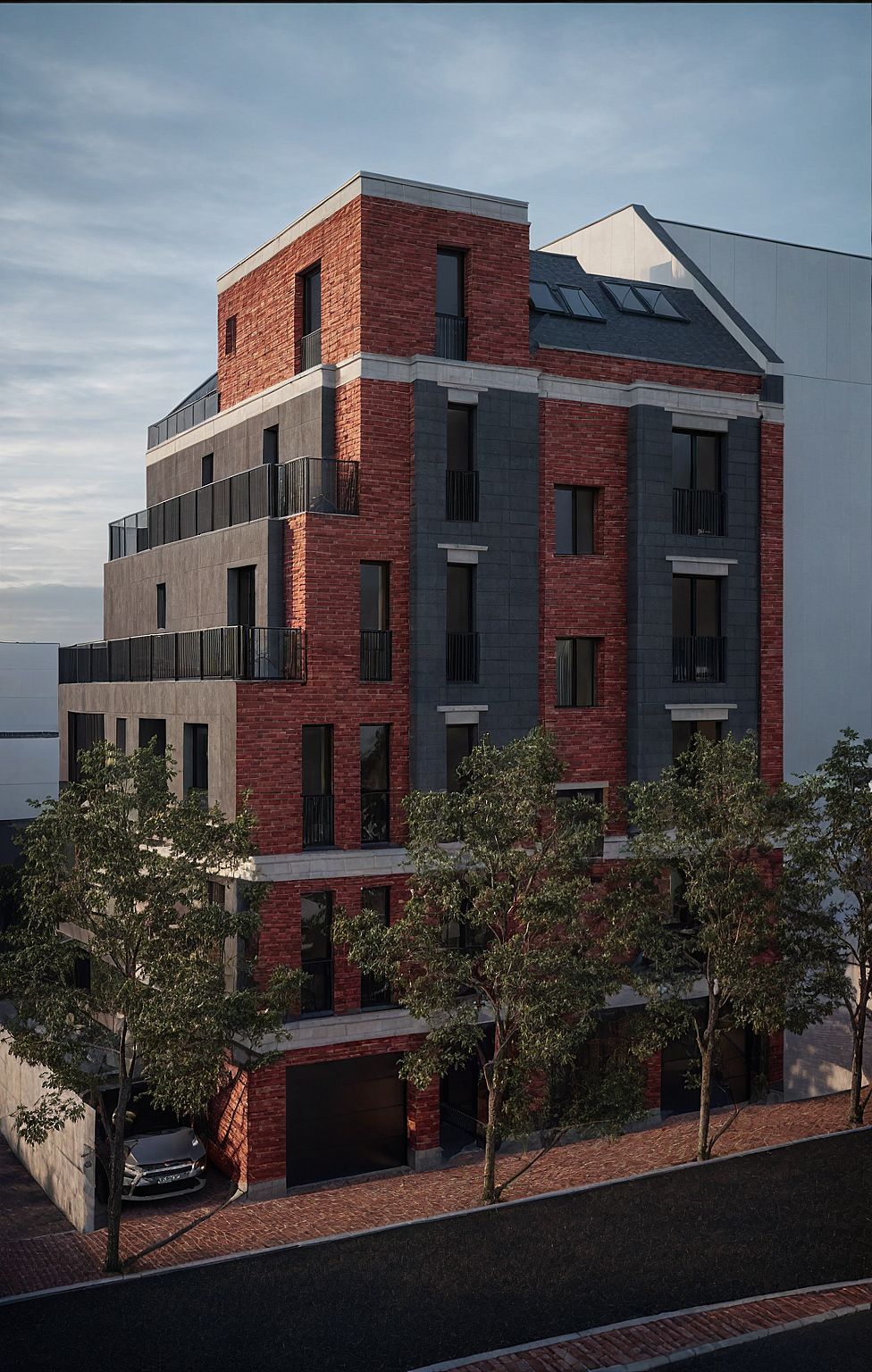red bricks facade, dark grey accent vertical