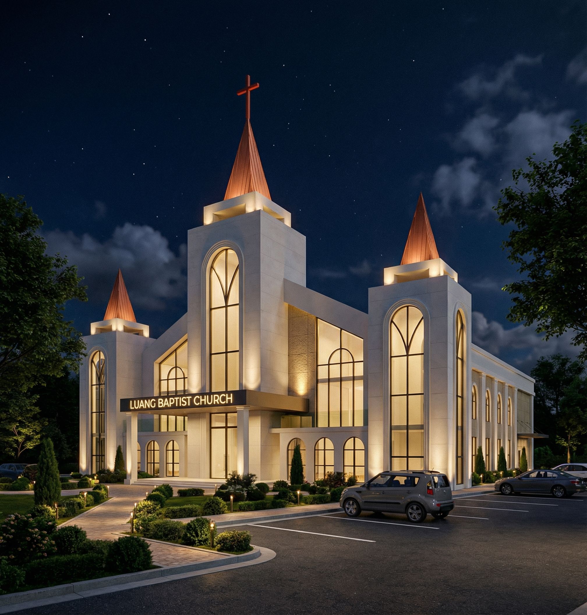 PromptA MINIMALIST CHURCH DESIGN, SUPER REALISTIC RENDER, ADD DETAILS, AMIC OF MODERN AND CLASSICAL architecture, keep exact camera angle