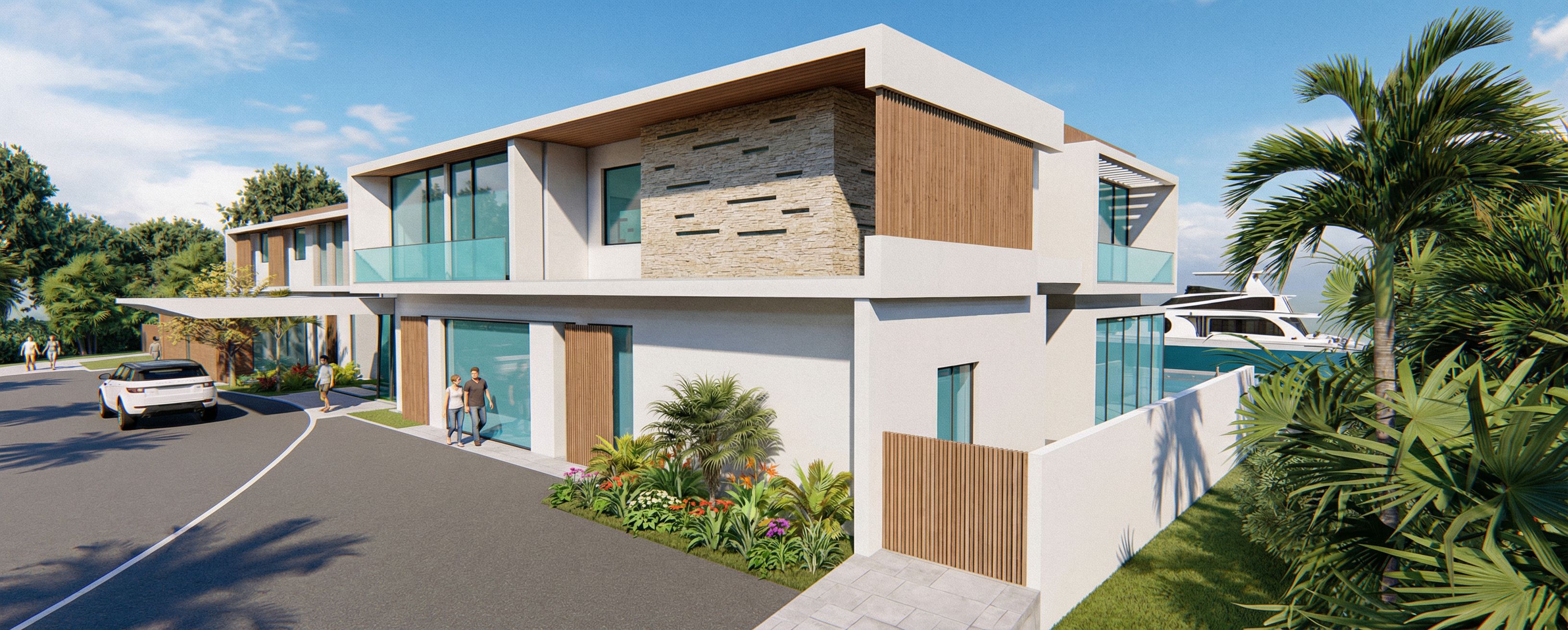 PromptMODERN HOUSE. CLEA SKY WITH SOME CLOUDS. ADD SOME VEGETATION TIPICAL FROM FLORIDA. ADD SOME PEOPLE WKING AROUND. GIVE TO THE GLASS A LIGHT BLUE TONE. KEEP THE POINT OF VIEW EXACT AS IT IS. , keep exact camera angle