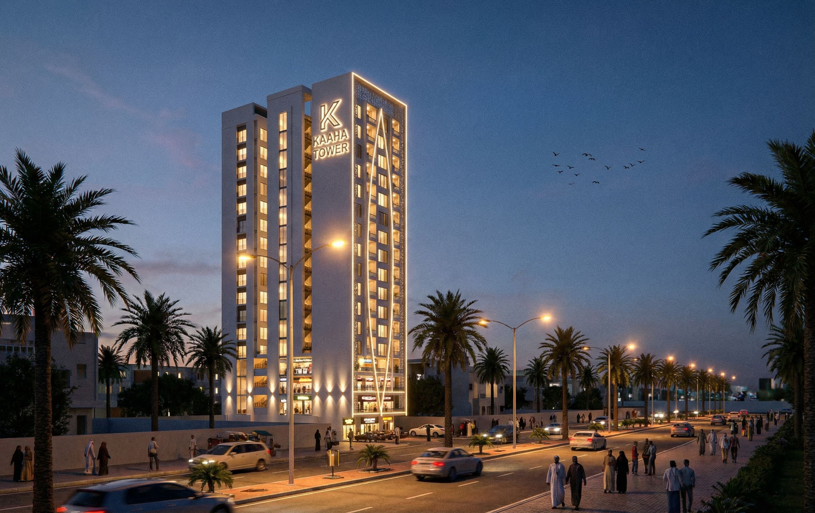 Perspective of a 16 storey building with ground and first , second and third floors as commercial spaces and fourth to sixteenth floors as apartments. Turn on the lights in the building. Use spot lights and rope lights in the building and introduce street lights.Use white wall master on the building and introduce people of Somali origin on the street. Introduce some birds in the sky and the environment a commercial building in Mogadishu Somalia. Use palm trees as landscaping. Introduce graphics "Kaaha Tower" on the building. , keep exact camera angle