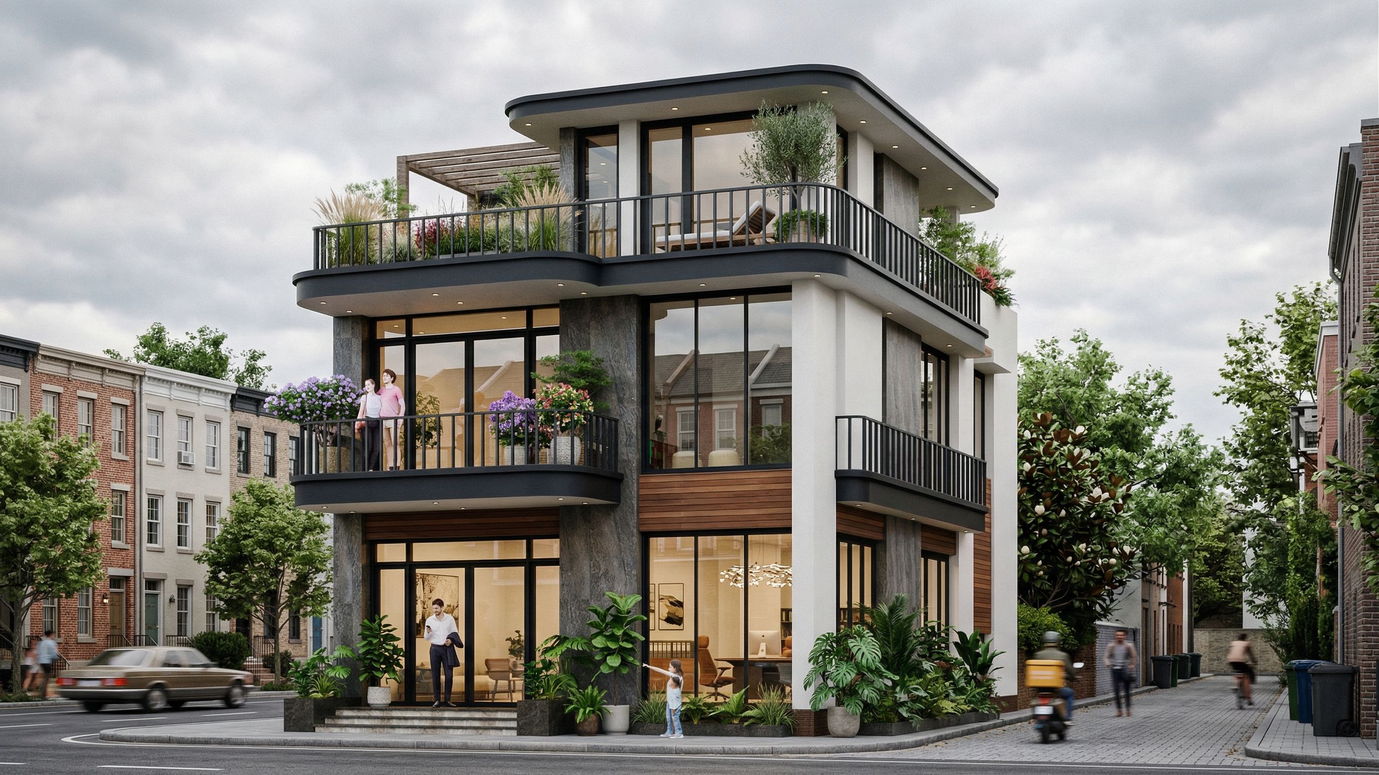 PromptThis photograph captures a modern three-story apartment building, notable for its combination of gleaming white walls, dark metal railings, and warm wood accents. Surrounding greenery and balconies create a vibrant atmosphere. The building is situated in a lush urban environment, with a small alley to the right and a row of townhouses to the left, contributing to an enhanced quality of life. Cloudy daylight creates soft shadows, illuminating the expansive glass facades. Inside, bright light highlights the reflections of the glass and surrounding structures. Without altering the building's structure, the photograph is taken from a low angle to emphasize its height, using a wide-angle lens to encompass the entire scene, highlighting the architectural features and the welcoming atmosphere., keep exact camera angle