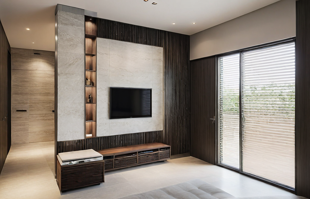 Promptmodern minimalist, with light grey accent color. Matte offwhite travertine tv panel. stainless panel. Wood blind window. Dark wood door. Light grey fluted panel.