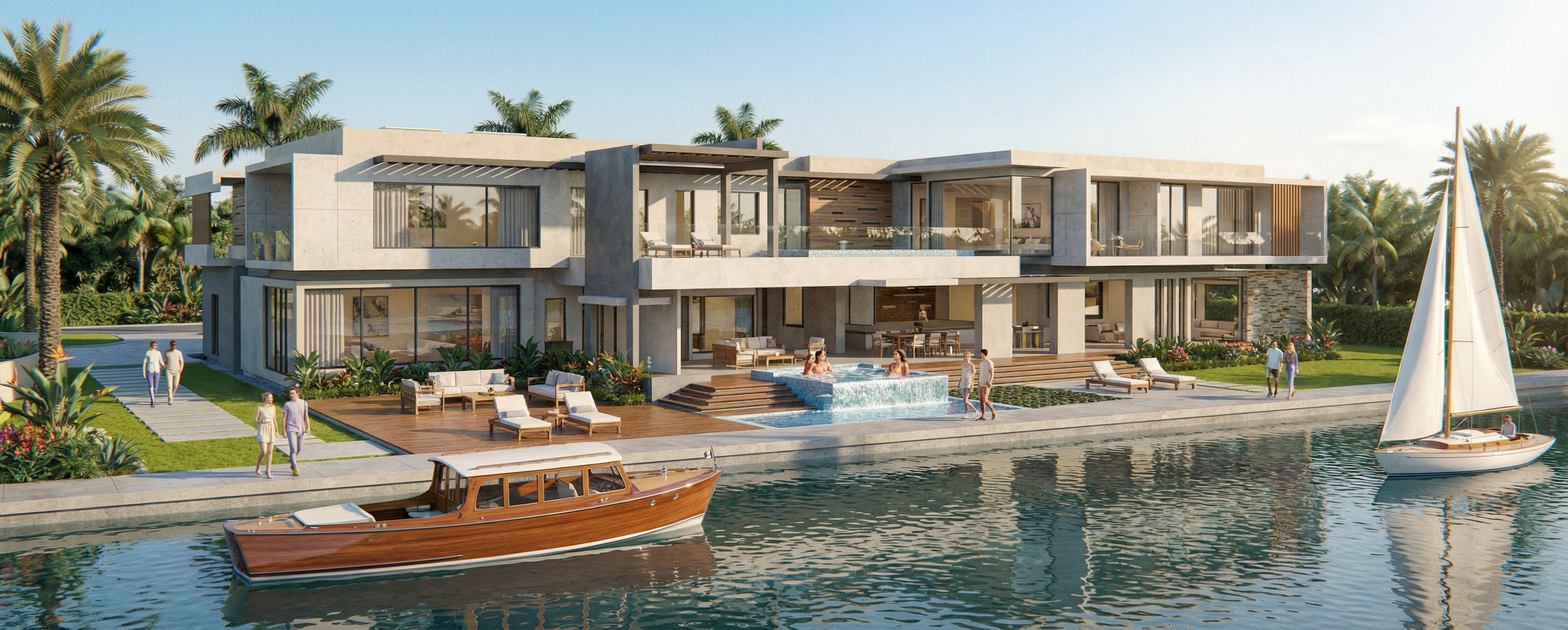 Promptthis image is the back facade of the reference image. the canal will pass in front of the image showing a boat and a sailboat passing by. show exterior elegant furniture. and two beautiful women in the jacuzzi. people walkin arround., keep exact camera angle