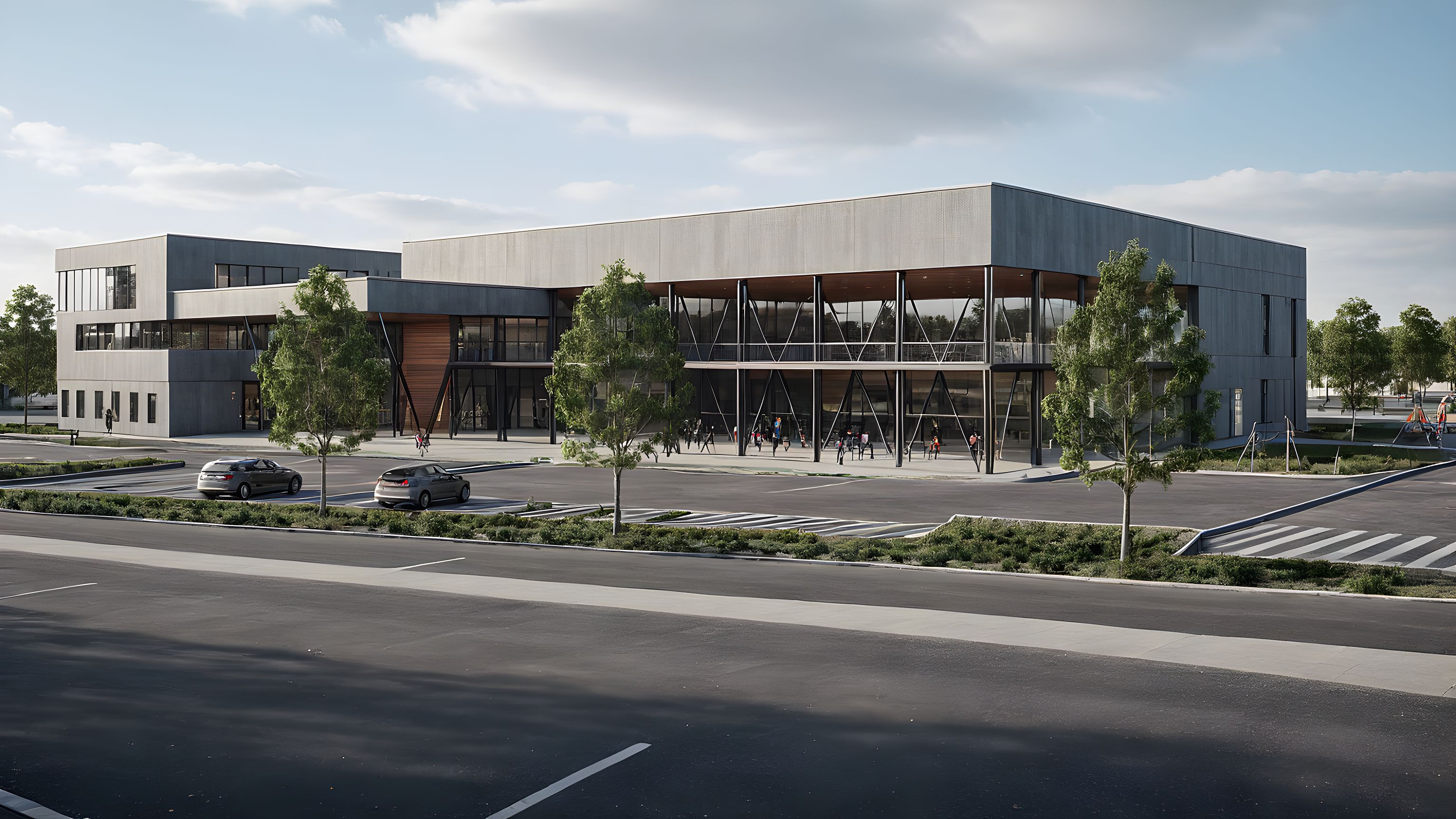 Promptexhibition venue, gray facades, road with few trees in the foreground, several people in front of the building, parking lot in front of the building, children's playground on the right
