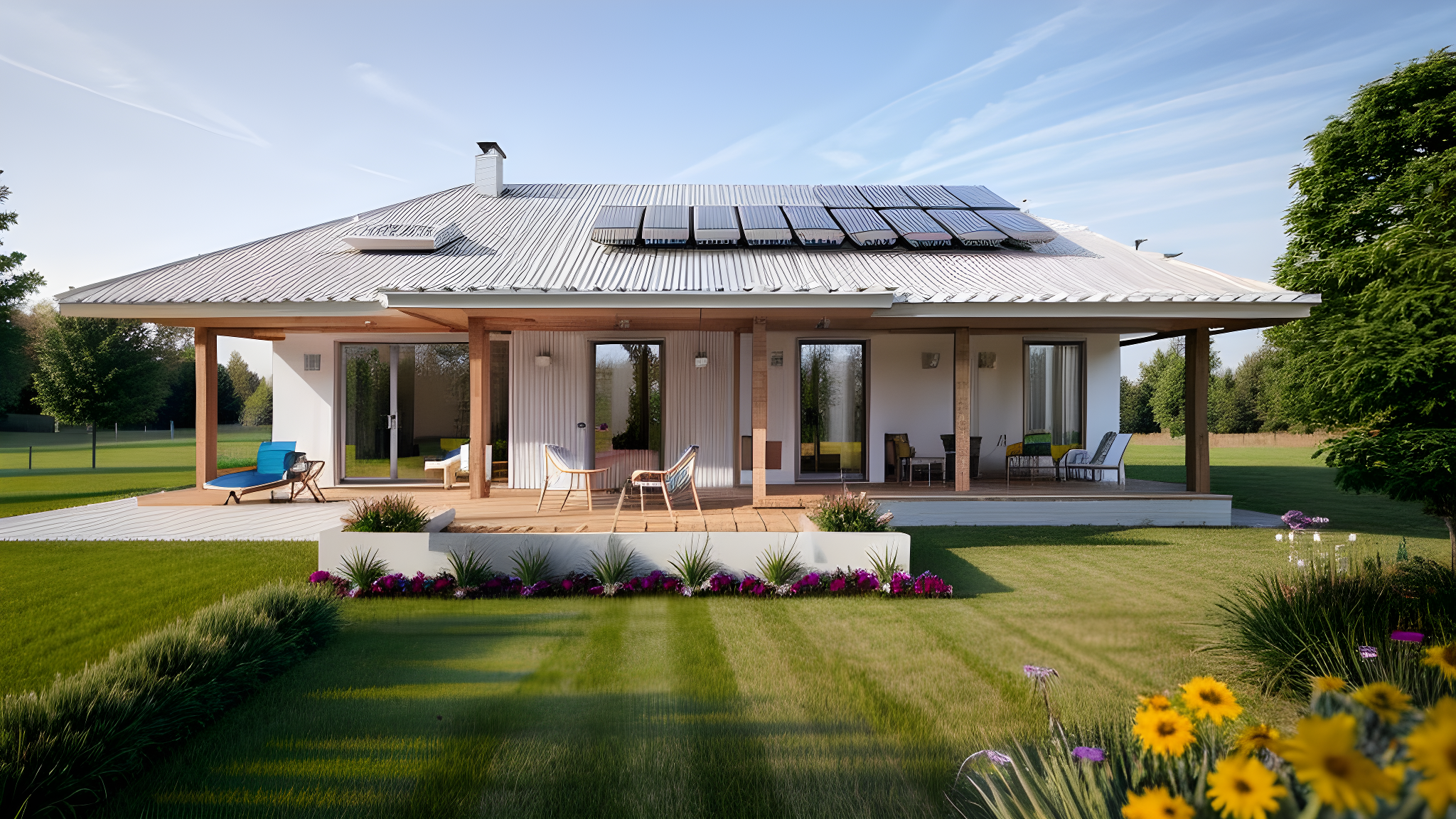 PromptSmall house in Romania, white plaster walls and wood, solar panel on roof, modern, with porch, grass in front