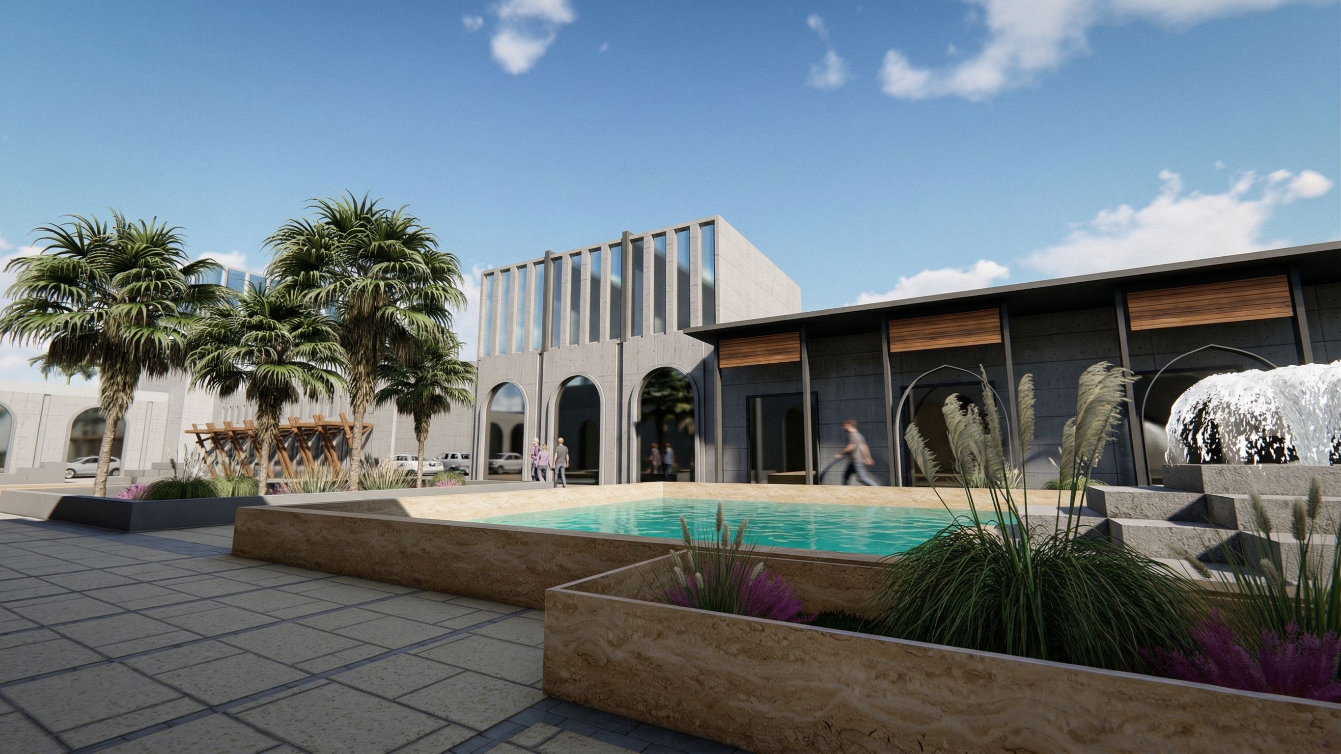 PromptTake the existing image of the commercial building. Do NOT change or modify the architectural design, massing, or proportions in any way. Preserve the original structure exactly as it is. Enhance only the visualization quality: upgrade materials to realistic natural stone, warm wood accents, and clear reflective glass. Improve lighting to be highly realistic and cinematic with natural daylight. Add realistic environment details: parked cars in the parking area, lush trees, greenery, and subtle water reflections if present. Make vegetation and landscape more natural and high-detail. Include people in the scene, but keep them out of focus and slightly blurred to create a realistic depth-of-field effect. They should feel natural, not staged or distracting. Wide view of a modern commercial craft market, featuring clean concrete walls, large glass panels, and perfectly tiled floors. Natural light, correct proportions and dimensions, with subtle—, keep exact camera angle