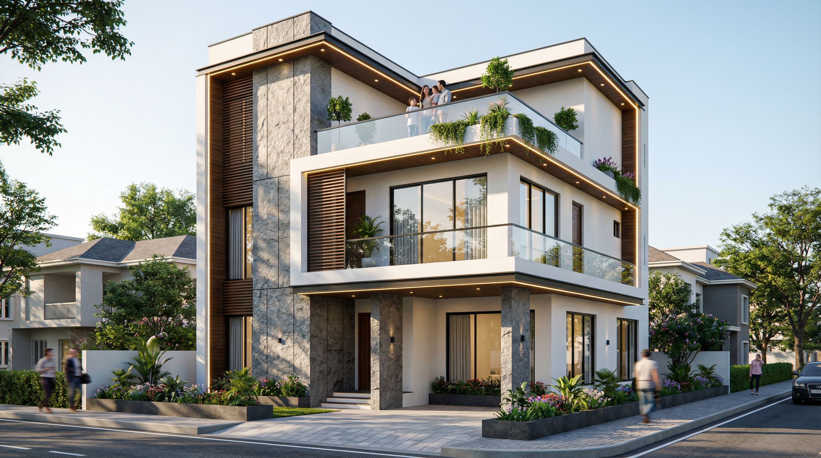 This photograph captures a modern villa with an elegant three-story design. The image emphasizes the contrast between smooth white surfaces and rough gray stone accents, along with large glass windows that enhance natural light. Small potted plants adorn the balconies, and the scene depicts a family of three – parents and child – standing on the third-floor terrace. The entire area beneath the balconies will be illuminated by LED lights, and LED strip lights will run along the balcony's edge. Situated in an urban environment, surrounded by other houses next to the main house and greenery in the background, the villa stands out with its minimalist landscape. The scene captures the morning sunlight, creating dynamic shadows on the facade. The original design angle is preserved, and a wide-angle lens is used to highlight the height and design details of the building, creating a vibrant and realistic architectural image., keep exact camera angle