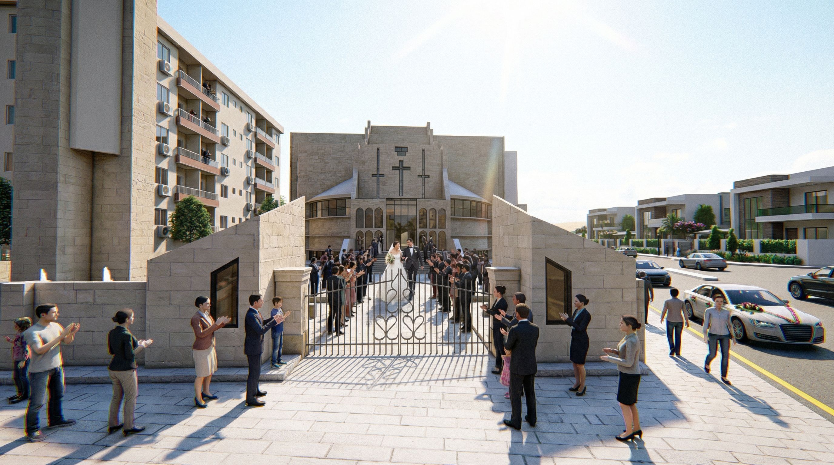 this is a scene of aN ENTRANCE OF church make the scene super realistic and the boxes on the right are villas .. make the streets realistic.. add to it cars AND PEDESTRIANS AND ENHAABCE THE MODELLING PROBLEMS AND THE PAVEEMNTS.. THE CHURCH HAS A CHRISTIAN WEDDING AND A GROOM AND A BRIDE COMES TOGETHER OUT OF THE CHURCH MAKE SURE THAT THE SCALE OF PEOPLE ARE 170 CM THE BUILDING ON THE LEFT OF THE CHURCH IS A RESIDENTIAL BUILDING THAT HAS APPARTMENTS PLEASE MAKE SURE THAT PEOPLE ARE SHORTER THAN THE CHURCH GATE A LITTLE .. , keep exact camera angle