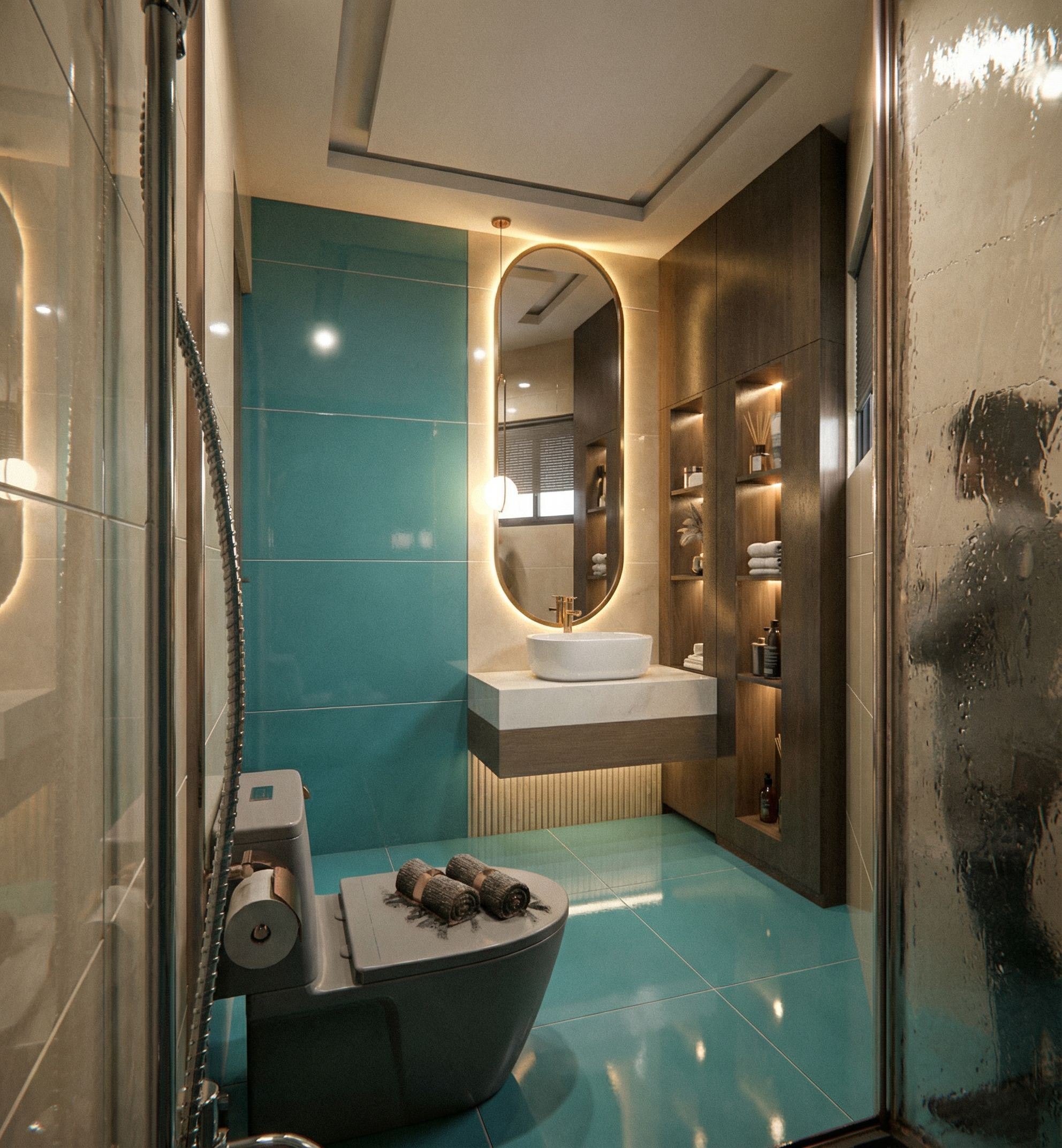 PromptUltra-realistic bathroom redesign and re-render based on the existing design. Preserve the original layout, dimensions, fixtures, and positions of all sanitary elements exactly as they are, with no changes to the design or spatial configuration. Update the material palette as follows: – Use glossy porcelain tiles in a rich turquoise color for the floor and the main feature wall. – Apply glossy beige porcelain tiles to all remaining walls for a clean, elegant contrast. Redesign the ceiling with a modern, minimal treatment, incorporating clean recessed details and a refined finish. Enhance the lighting design with soft, warm-neutral ambient lighting, including concealed LED strip lighting around the mirrors and inside the hidden shelves to create depth and visual interest. Adjust the camera angle to a more refined and balanced perspective that enhances spatial perception and realism. Improve material quality, surface reflections, textures, and accurate light interaction to achieve a highly realistic result, with natural light balance, soft shadows, and true-to-life reflections. Overall style should feel modern, elegant, and luxurious, with a strong emphasis on realism, high-end rendering quality, and professional interior visualization., keep exact camera angle