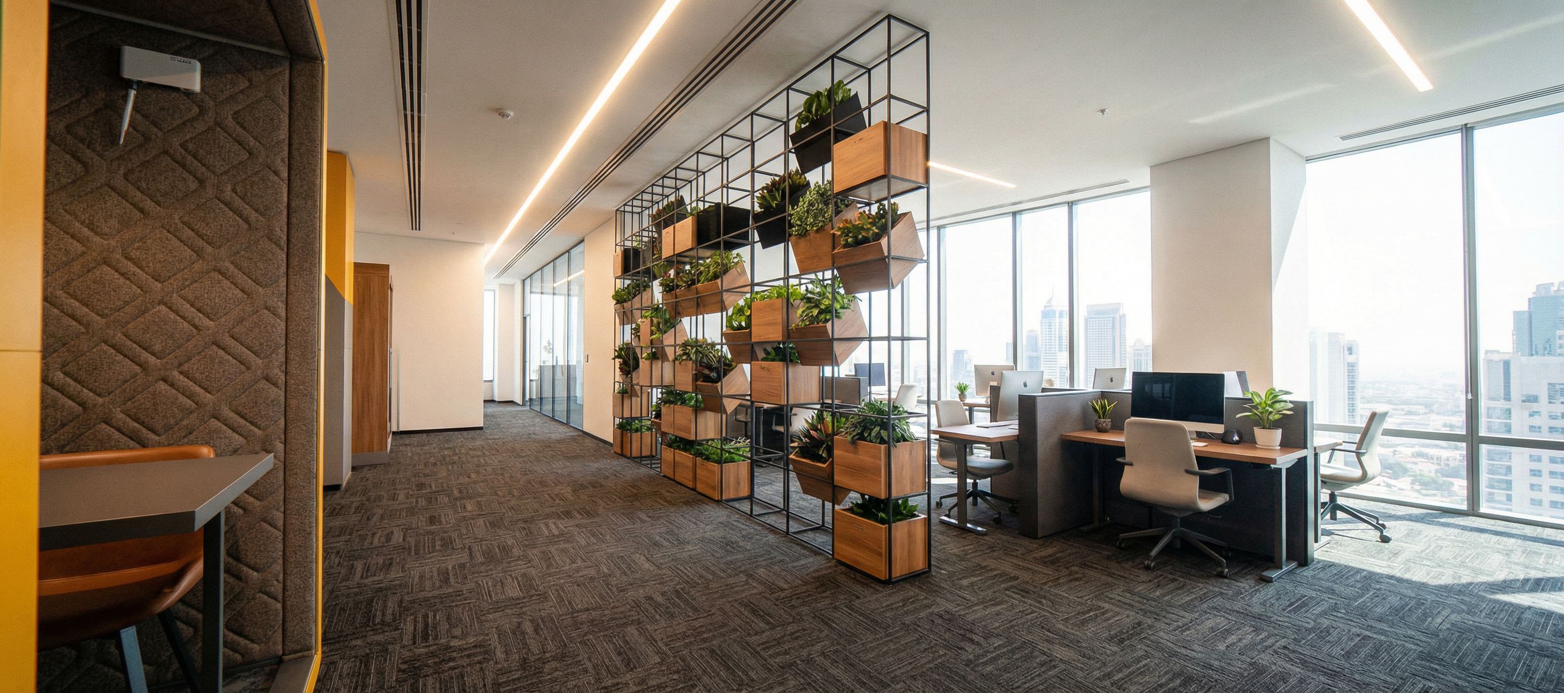 a photorealistic render of an executive office and lobby, Carpeted floor, rich materials, clean line, linear light in the ceiling with groves, indoor plants and office furniture, keep exact camera angle. bright interior, keep exact camera angle