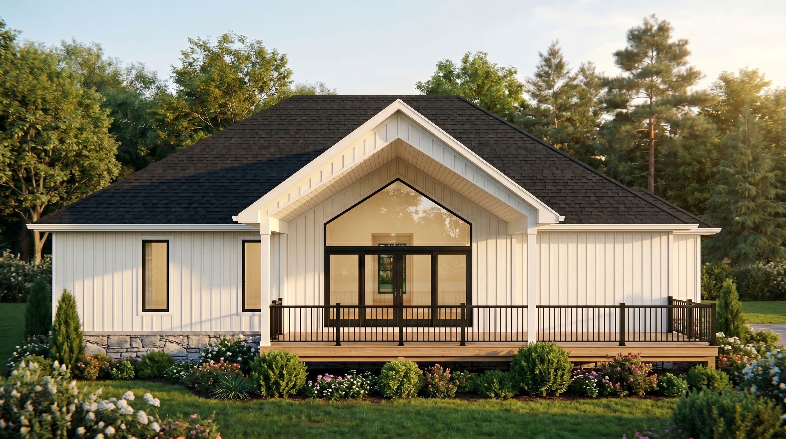 PromptA photo of a covered rear deck, the middle part of the deck has a roof and the right side is a sun deck, show the windows on the left rear side only as shown, show railings with black spindles, white vertical siding, black shingle roof, landscaping and plants in front of the deck, the reference photo attached is the front of this home, please use the same elements and style, no gable beam or brackets, so furniture, attach the windows to the patio door, no spacing, no grills, keep exact camera angle