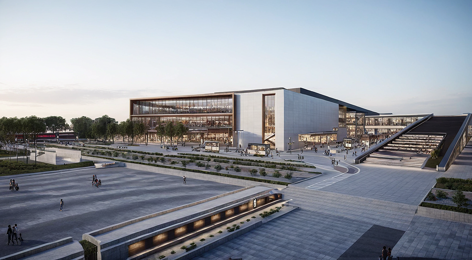 PromptRender and design the facade of this civil building (a museum, shopping center, cinema) in a social district in the center of the city. Also add greenery where possible. add steeped seating with greenery to the ramp. be practical with the stepped seating and steps. the train carts are kiosks. keep all images i upload for this prompt within a similar theme.