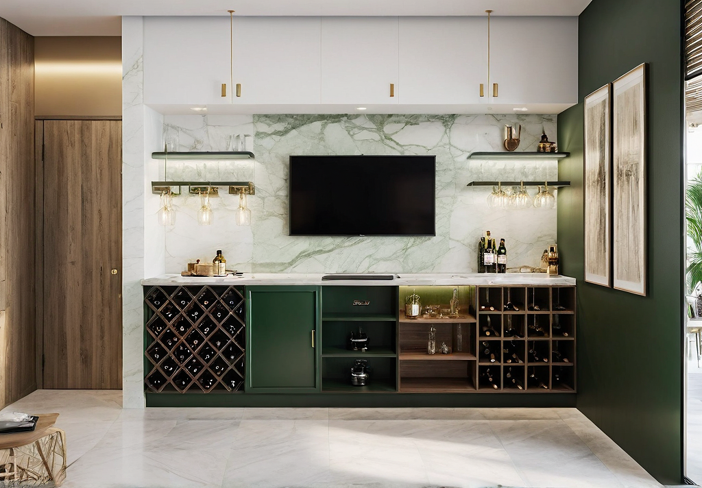 Promptbarra de bar con carpinteria verde olivo, muros blancos y muro con tv con acabado de marmol blanco