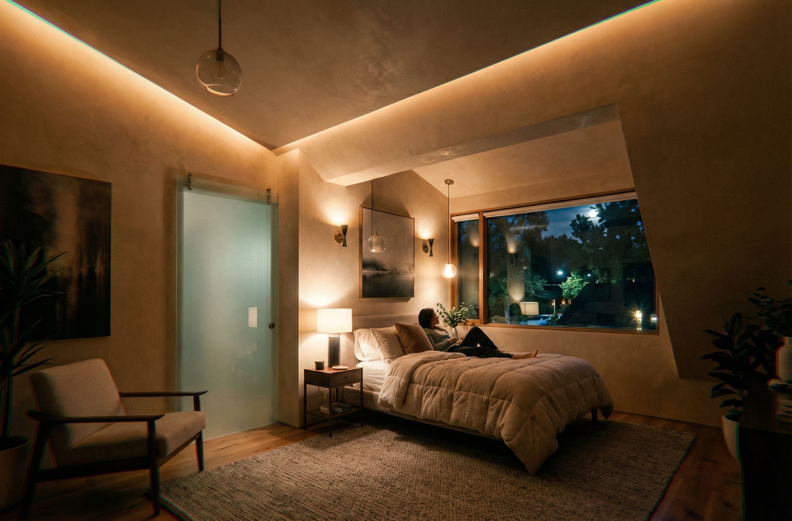 Promptmodern second floor bedroom, hardwood floors and area carpet, venetian plaster walls and ceilings, translucent glass sliding door, looking out and down to trees and sunshine, queen bed in front of window , keep exact camera angle