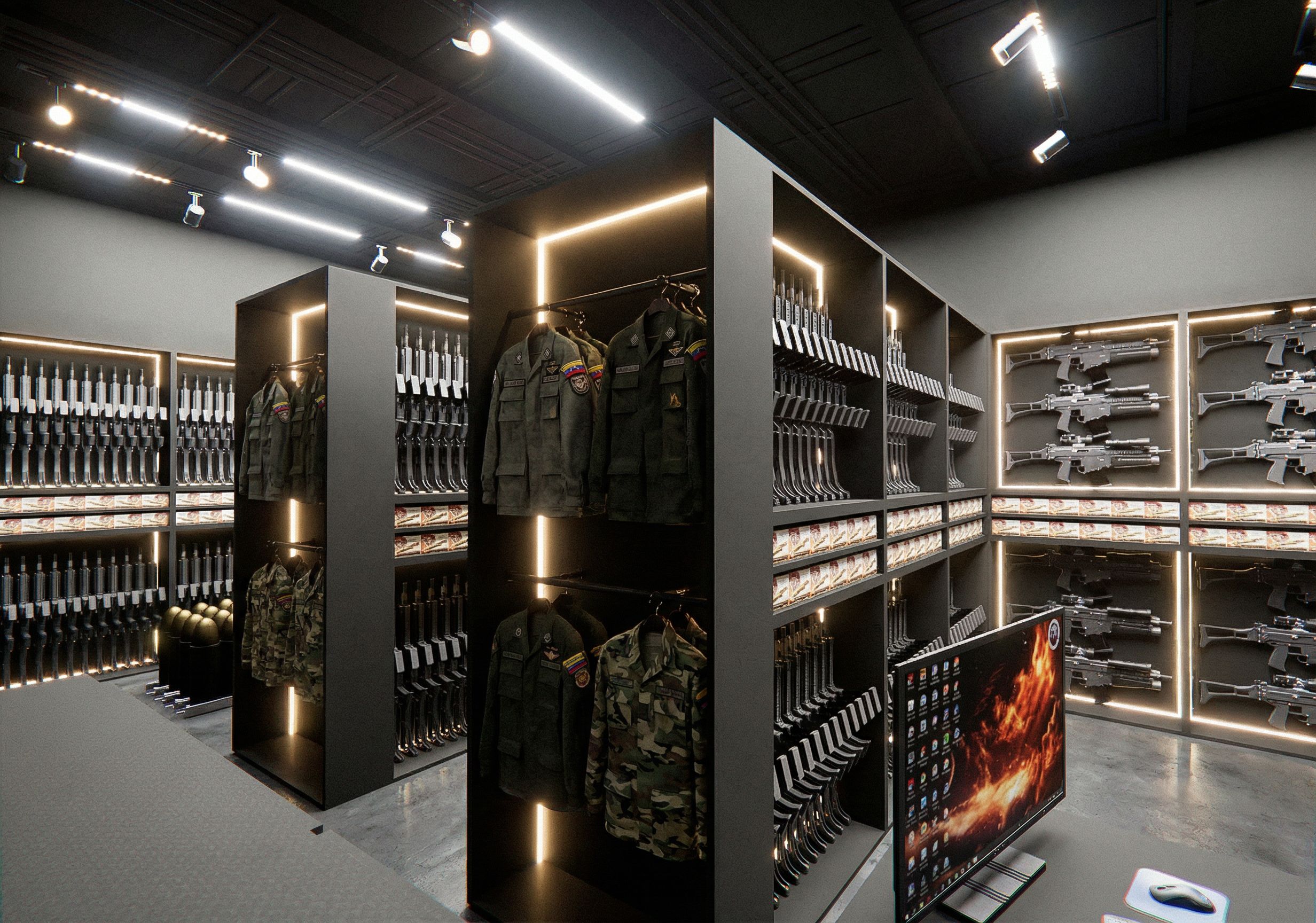 porfavor convierte este render en una imagen realista, no puedes modificar NADA ni colores ni mobiliario, ni color de piso, mejora el efecto de la luz que de techo es blanca y de mobiliario mas calida y porfavor quita las dos puertas de los muebles frontales y coloca uniformes de la guardia nacional bolivariana de venezuela guindados, keep exact camera angle